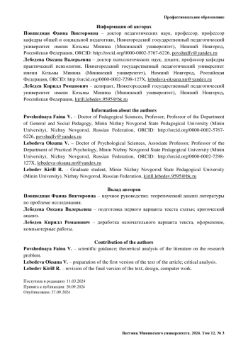 10. Игнатьева Г. А., Гришина А. В., Самерханова Э. К., Тулупова О. В. Рефлексивно-персонализированная модель формирования педагогической позиции наставника по развитию // Вестник Мининского университета. 2022. Т. 10, № 4. С. 12. URL: https://www.minin-vestnik.ru/jour/article/view/1376/925 (дата обращения: 02. 09. 2024).