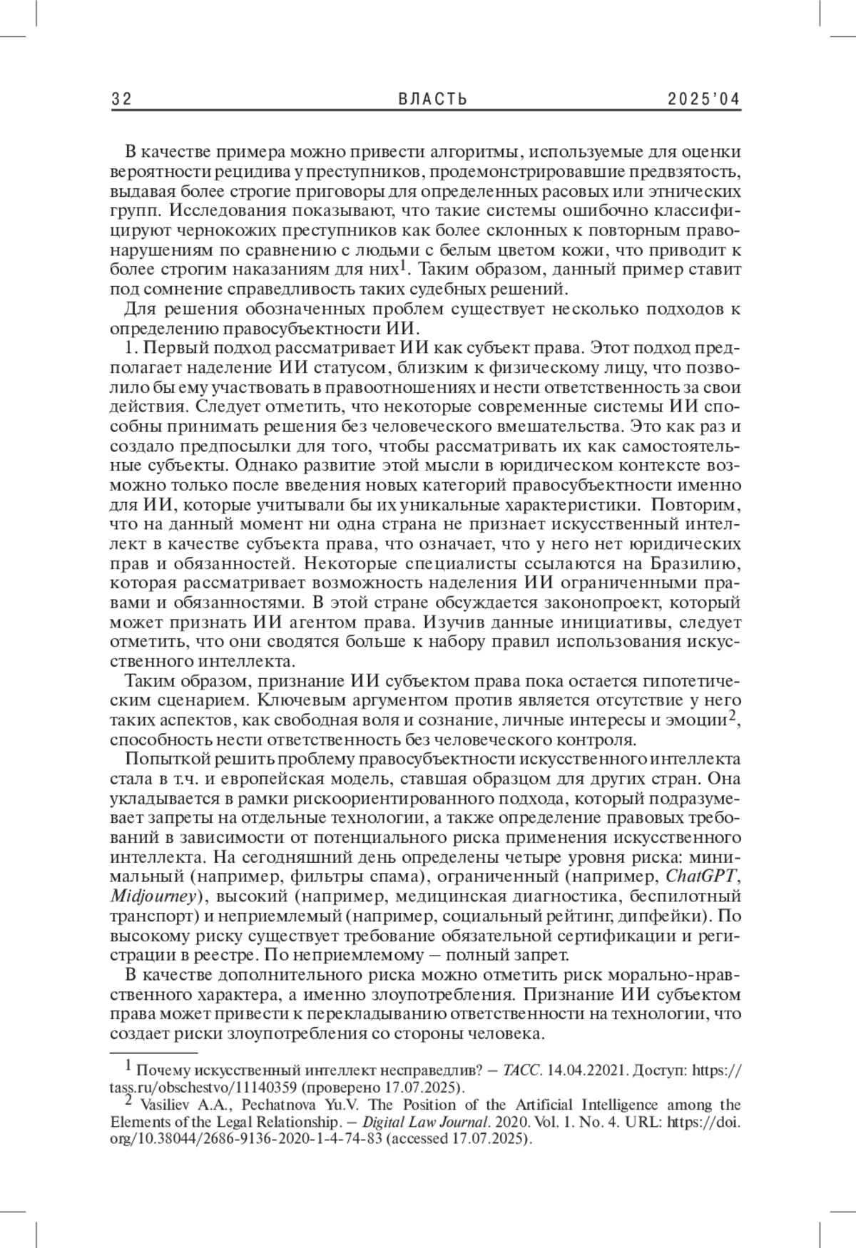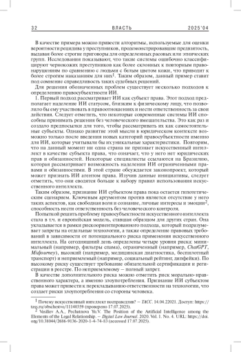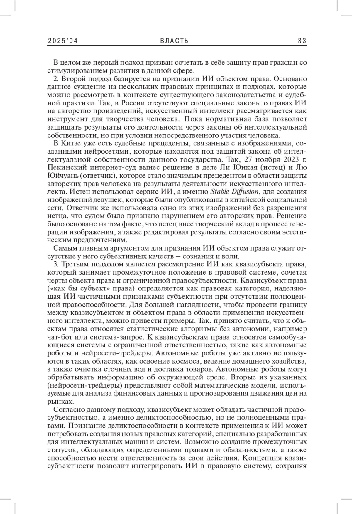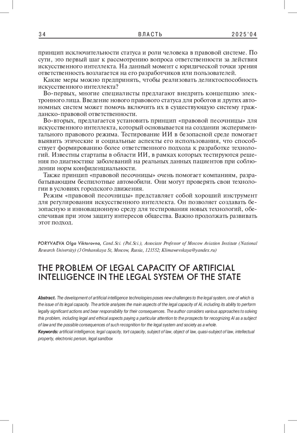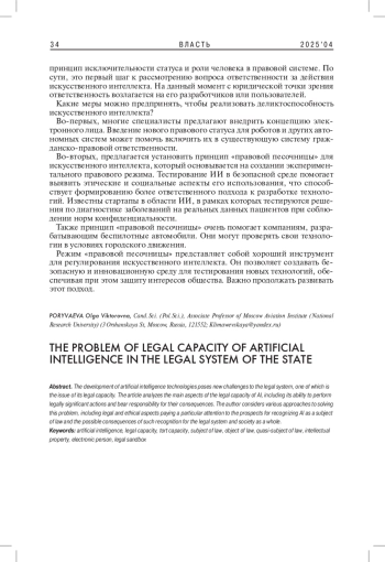 Развитие технологий искусственного интеллекта ставит перед правовой системой новые вызовы, одним из которых является вопрос о его правосубъектности. В статье анализируются основные аспекты правосубъектности ИИ, включая его способность совершать юридически значимые действия и нести ответственность за их последствия. Автор рассматривает различные подходы к решению этой проблемы, включая правовые и этические аспекты, уделяя особое внимание перспективам признания ИИ в качестве субъекта права и возможным последствиям такого признания для правовой системы и общества в целом.