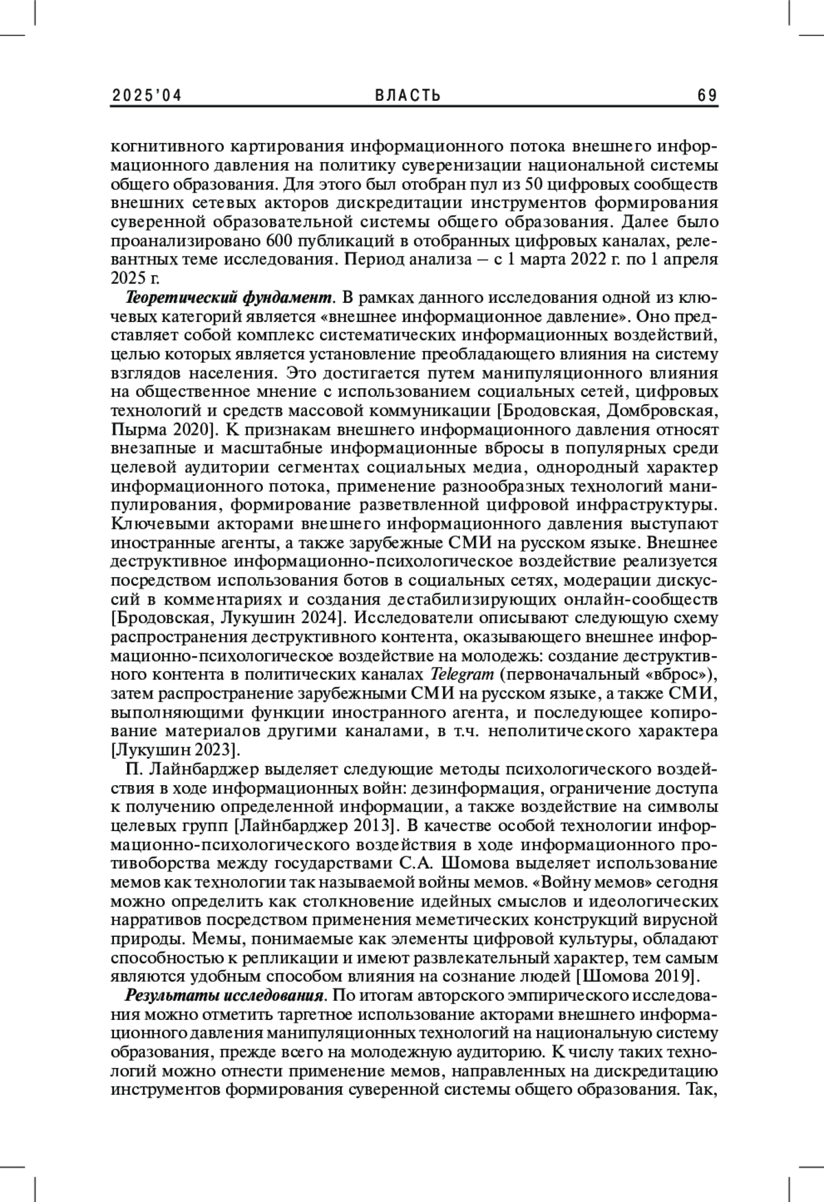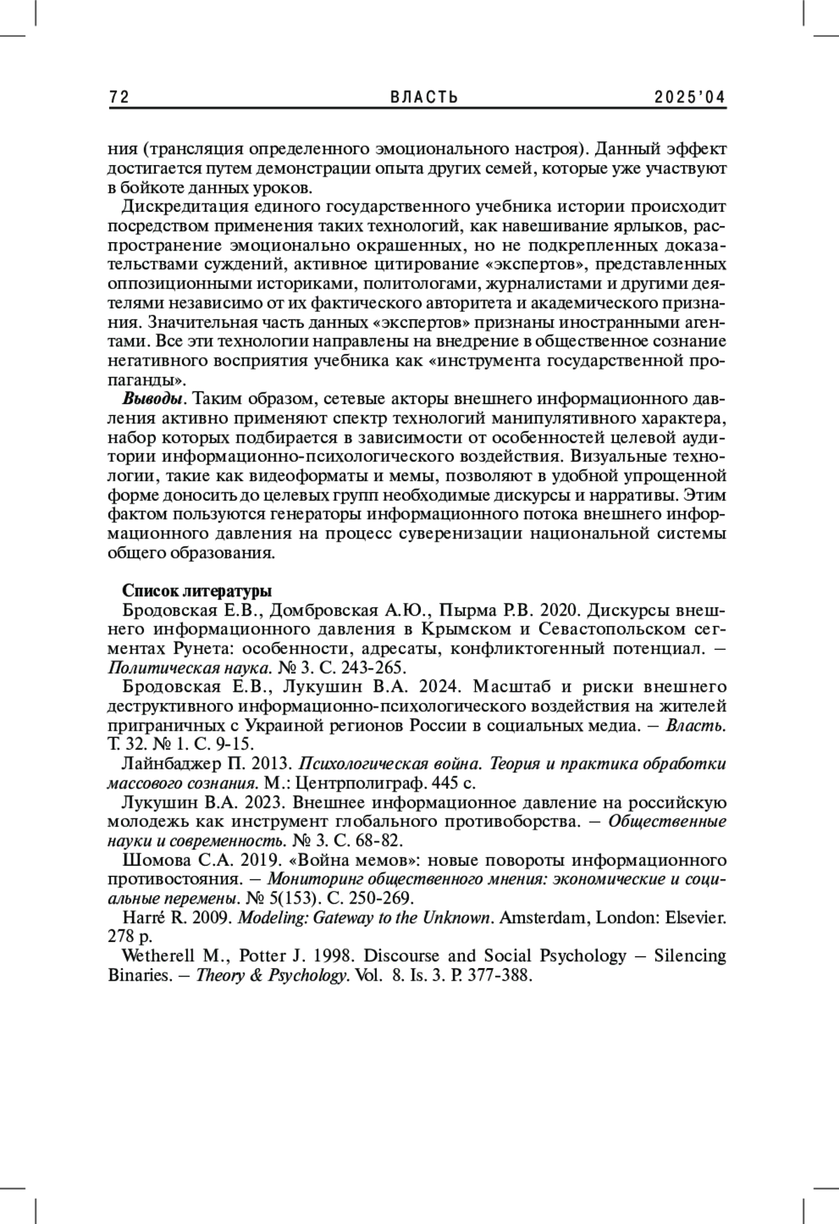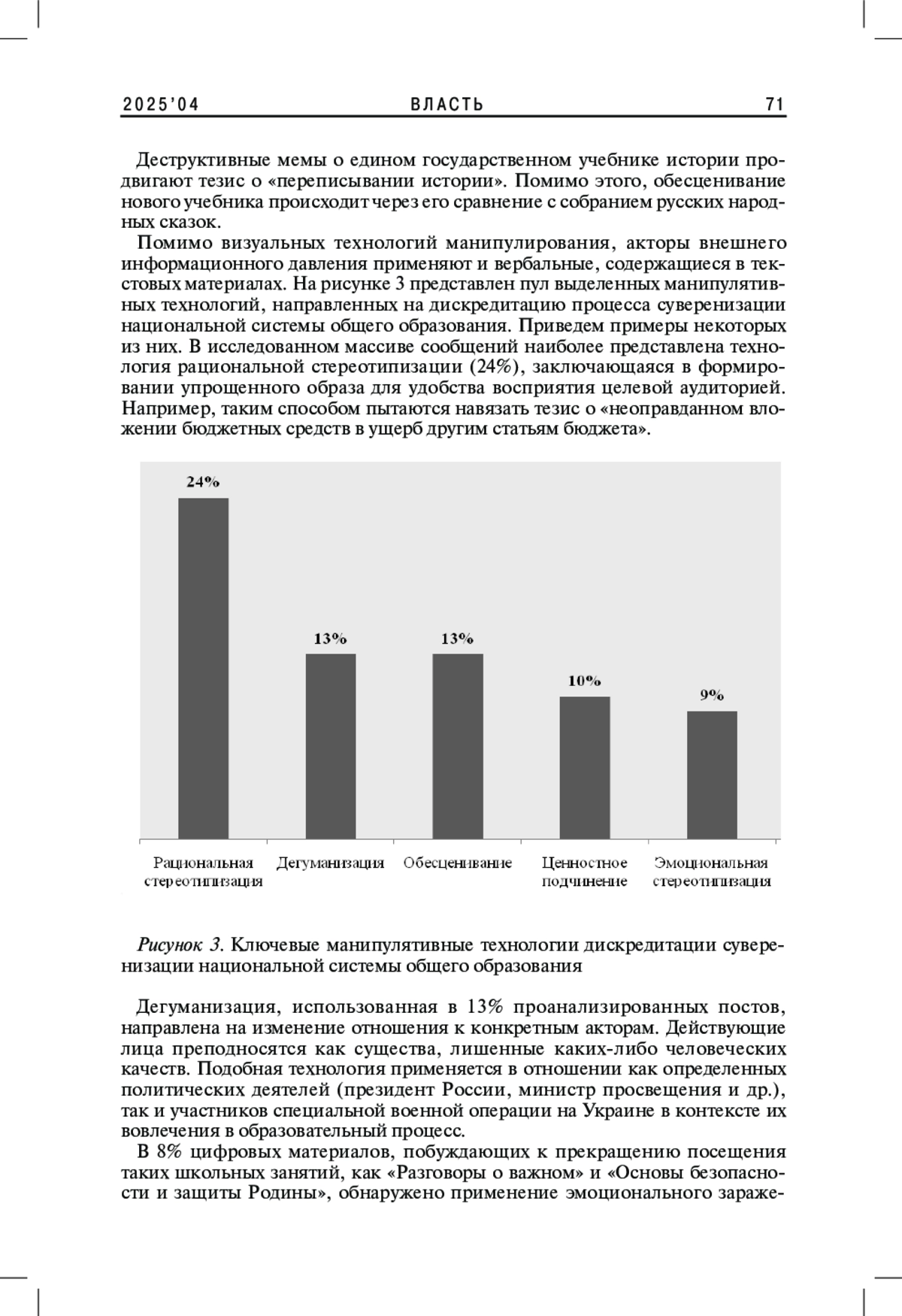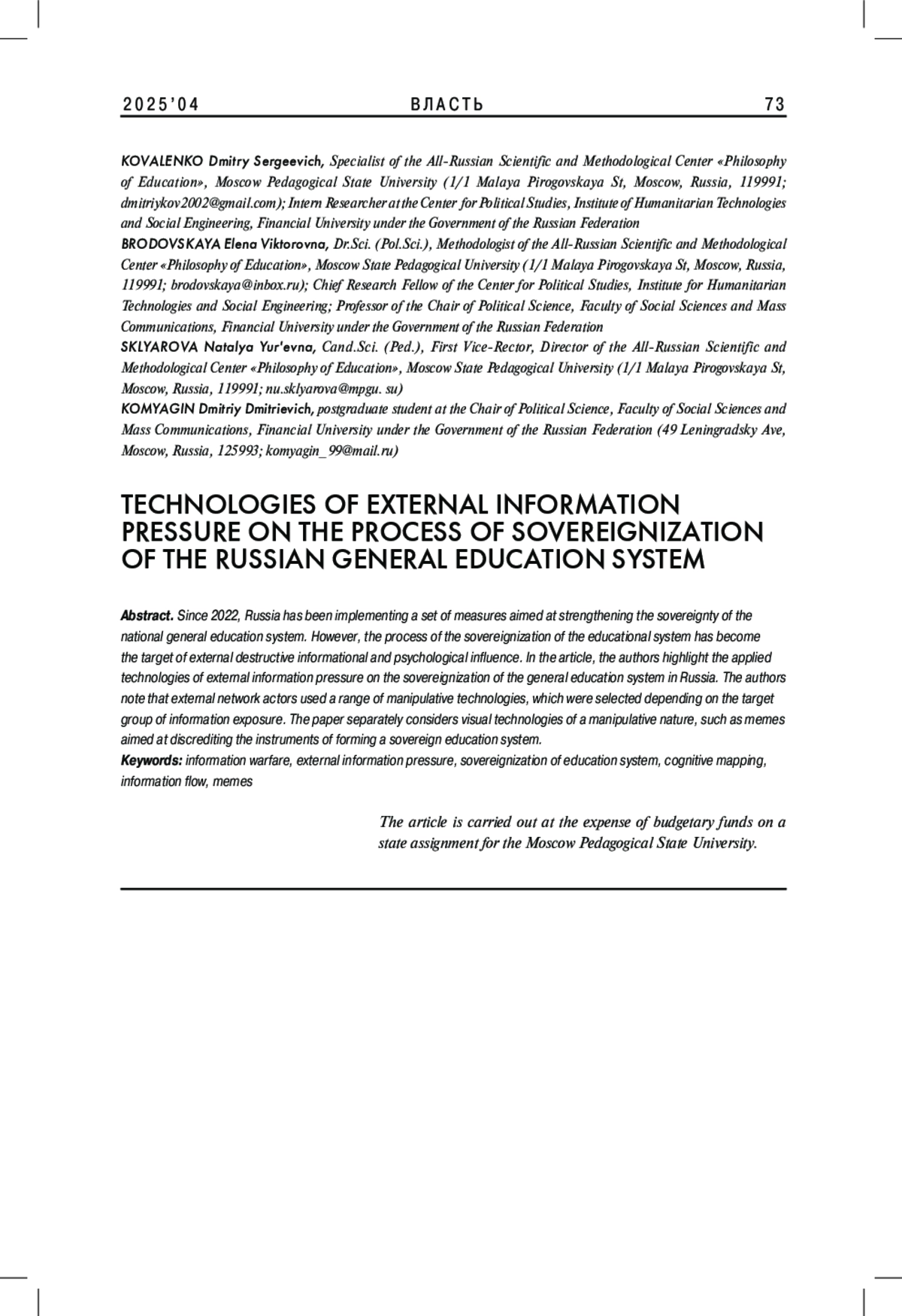 КОВАЛЕНКО Д. С., БРОДОВСКАЯ Е. В., СКЛЯРОВА Н. Ю., КОМЯГИН Д. Д. ТЕХНОЛОГИИ ВНЕШНЕГО ИНФОРМАЦИОННОГО ДАВЛЕНИЯ НА ПРОЦЕСС СУВЕРЕНИЗАЦИИ РОССИЙСКОЙ СИСТЕМЫ ОБЩЕГО ОБРАЗОВАНИЯ // ВЛАСТЬ. 2025. ТОМ 33 № 4