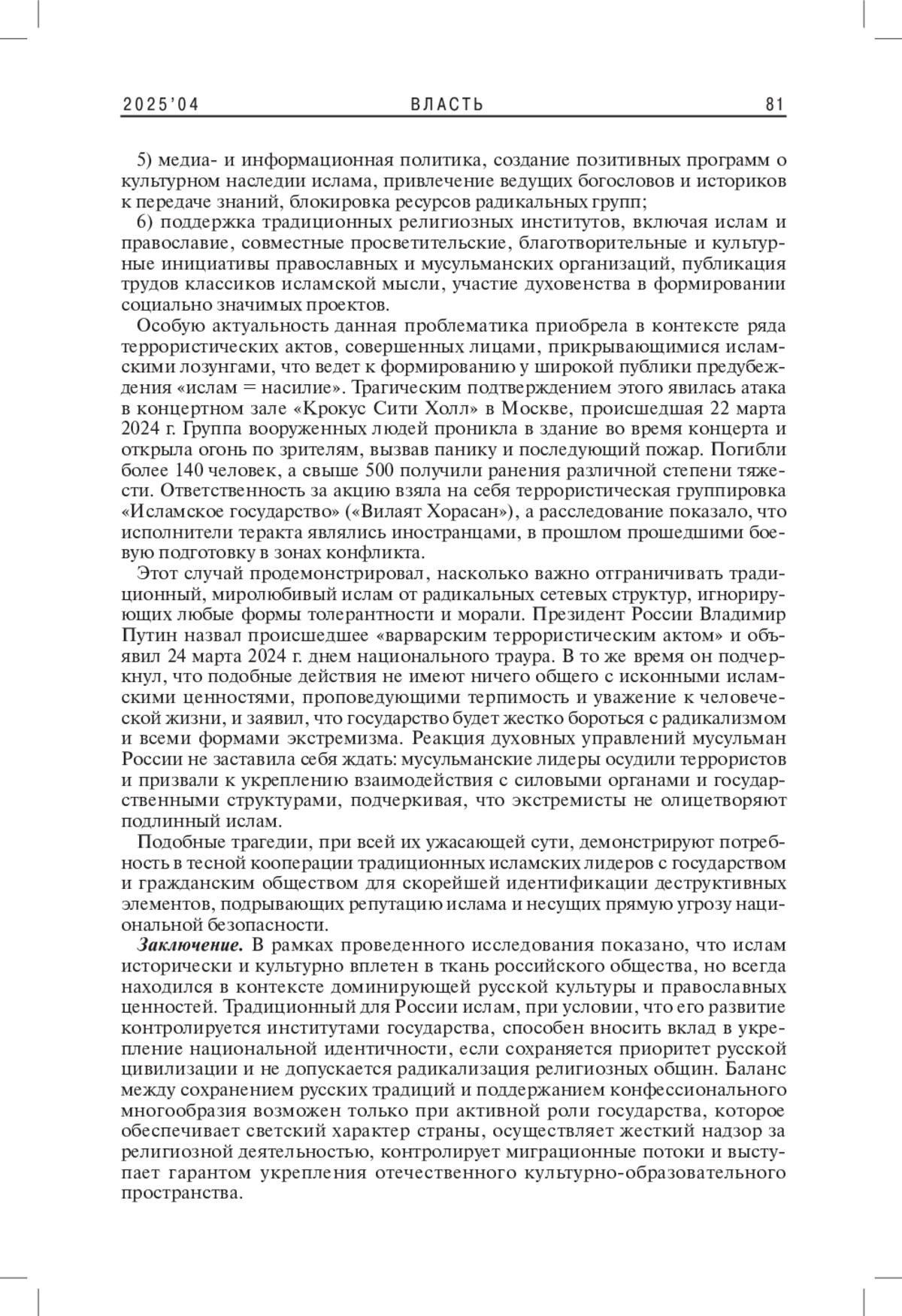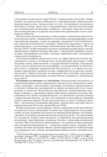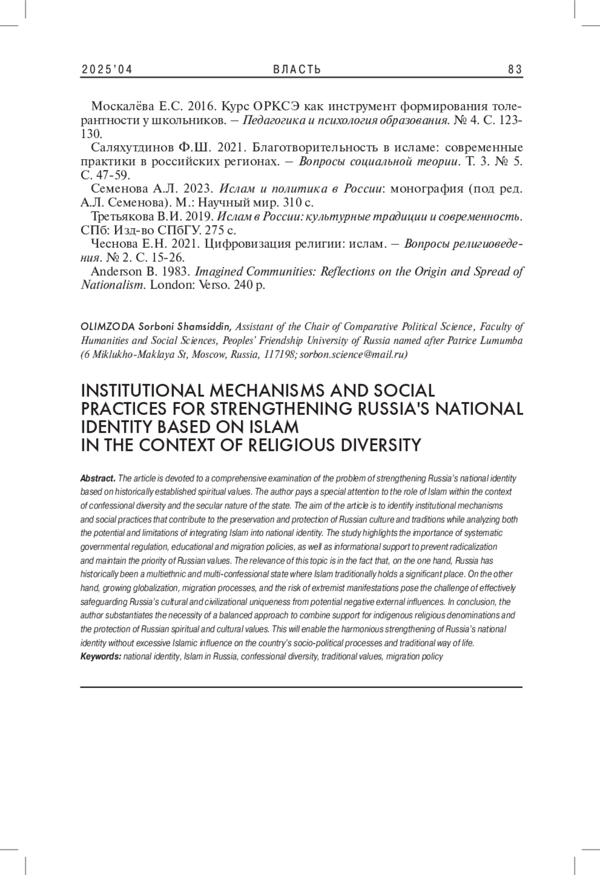 Статья посвящена комплексному рассмотрению проблемы укрепления национальной идентичности России на основе исторически сложившихся духовных ценностей, при этом особое внимание уделяется роли ислама в условиях конфессионального многообразия и светского характера государства. Автор ставит цель - выявить институциональные механизмы и общественные практики, способствующие сохранению и защите русской культуры и традиций, а также анализирует потенциал и ограничения интеграции ислама в общенациональную идентичность. При этом подчеркивается важность системных мер государственного регулирования, образовательной и миграционной политики, а также информационного сопровождения с целью предотвращения радикализации и сохранения приоритета русских ценностей. Значимость темы объясняется тем, что, с одной стороны, Россия исторически отличается многонациональным и многоконфессиональным составом, где ислам традиционно занимает весомое место; с другой - растущая глобализация, миграционные процессы и риск экстремистских проявлений ставят перед российским обществом задачу эффективно оградить свою культурную и цивилизационную самобытность от возможного негативного влияния внешних факторов. В заключение обосновывается необходимость сбалансированного подхода, сочетающего поддержку исконных религиозных конфессий и защиту русских духовно-культурных ценностей, что позволит гармонично укреплять национальную идентичность России без чрезмерного влияния ислама на общественно-политические процессы и традиционный уклад страны.