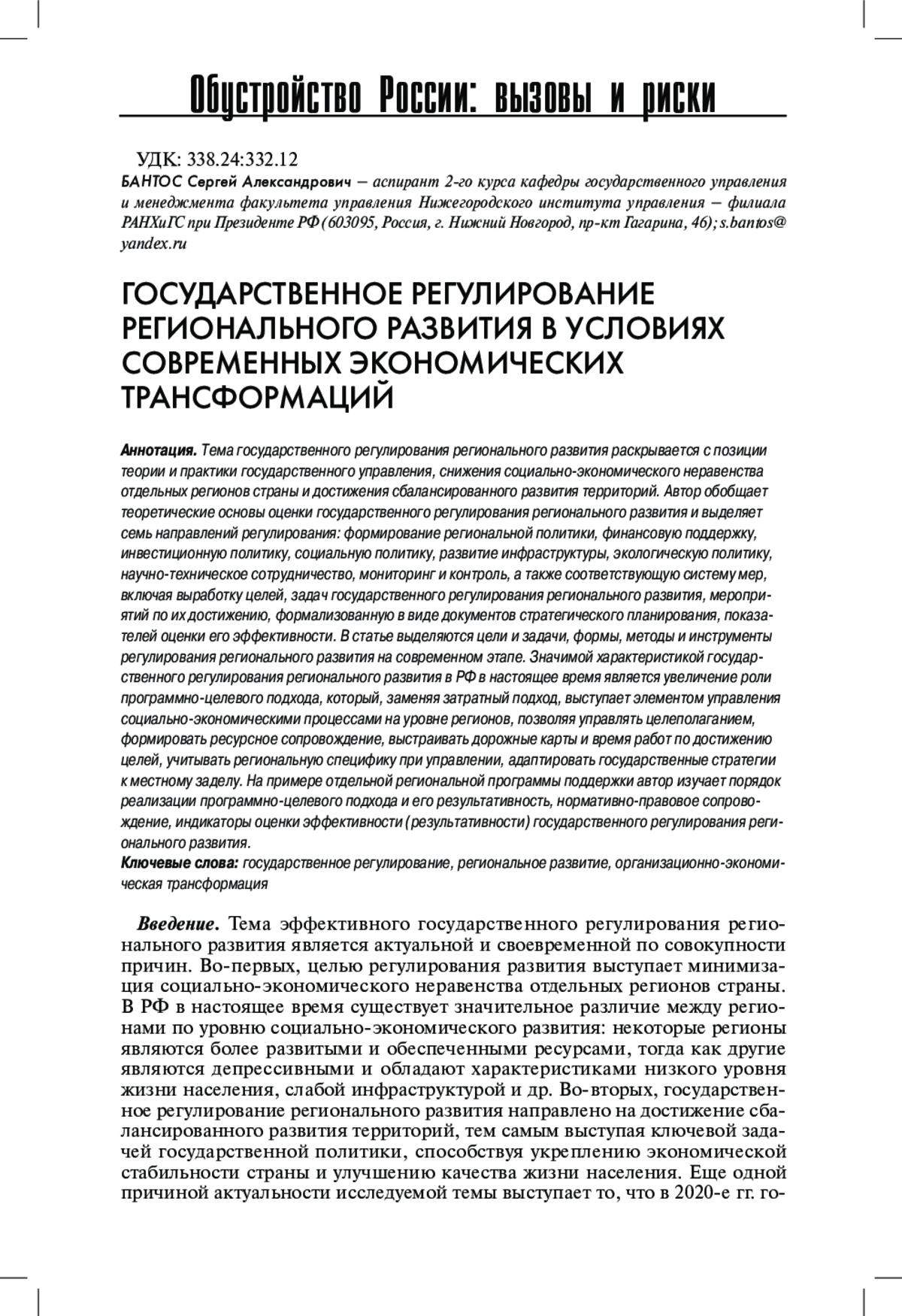 Тема государственного регулирования регионального развития раскрывается с позиции теории и практики государственного управления, снижения социально-экономического неравенства отдельных регионов страны и достижения сбалансированного развития территорий. Автор обобщает теоретические основы оценки государственного регулирования регионального развития и выделяет семь направлений регулирования: формирование региональной политики, финансовую поддержку, инвестиционную политику, социальную политику, развитие инфраструктуры, экологическую политику, научно-техническое сотрудничество, мониторинг и контроль, а также соответствующую систему мер, включая выработку целей, задач государственного регулирования регионального развития, мероприятий по их достижению, формализованную в виде документов стратегического планирования, показателей оценки его эффективности. В статье выделяются цели и задачи, формы, методы и инструменты регулирования регионального развития на современном этапе. Значимой характеристикой государственного регулирования регионального развития в РФ в настоящее время является увеличение роли программно-целевого подхода, который, заменяя затратный подход, выступает элементом управления социально-экономическими процессами на уровне регионов, позволяя управлять целеполаганием, формировать ресурсное сопровождение, выстраивать дорожные карты и время работ по достижению целей, учитывать региональную специфику при управлении, адаптировать государственные стратегии к местному заделу. На примере отдельной региональной программы поддержки автор изучает порядок реализации программно-целевого подхода и его результативность, нормативно-правовое сопровождение, индикаторы оценки эффективности (результативности) государственного регулирования регионального развития.