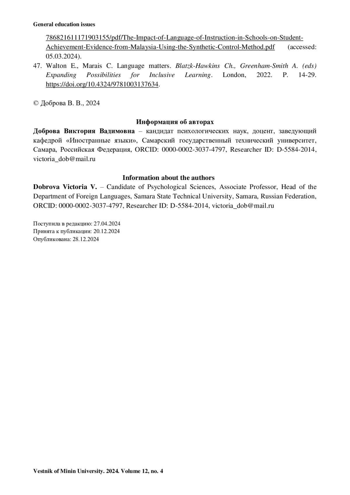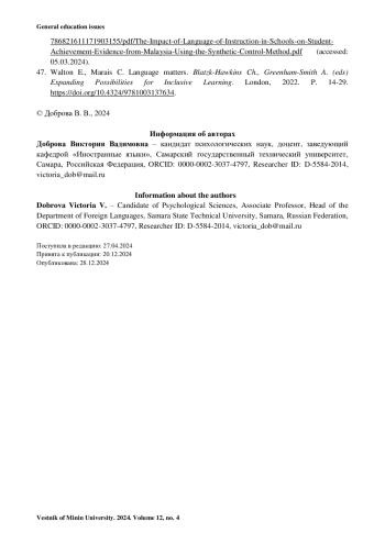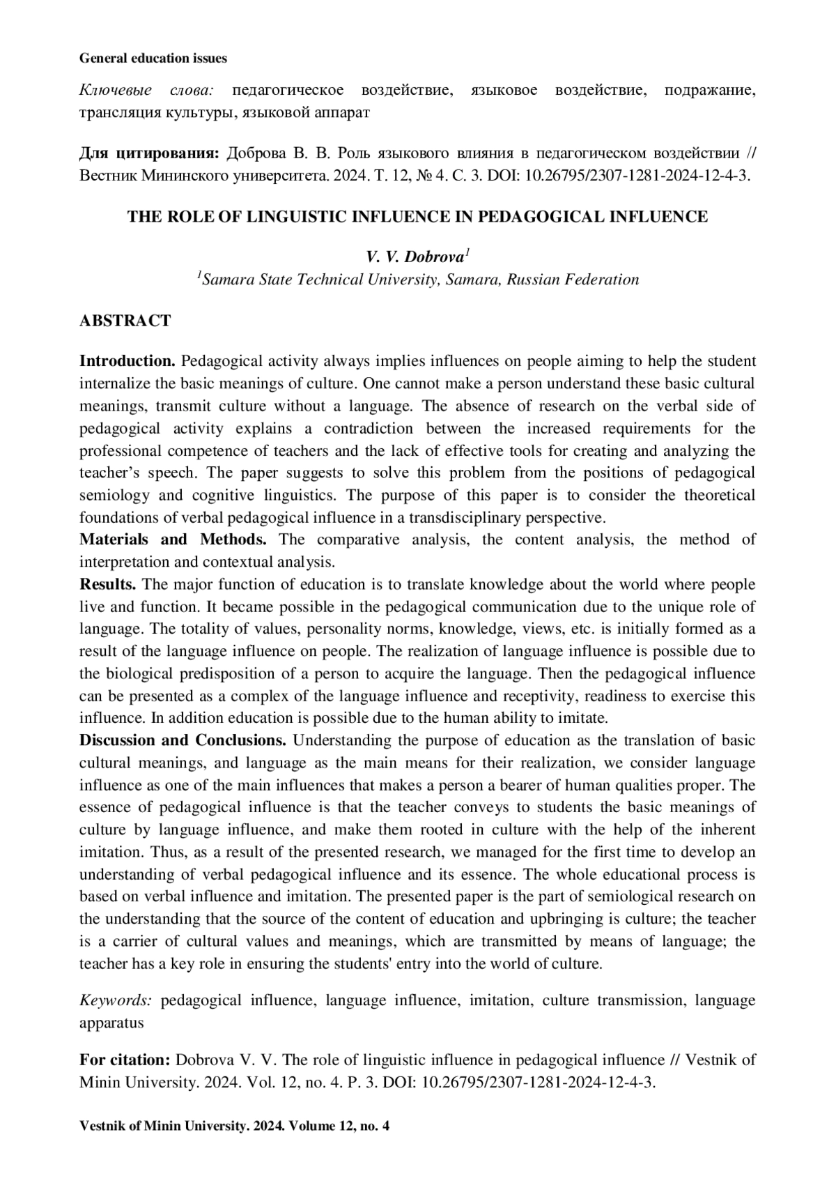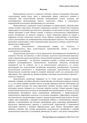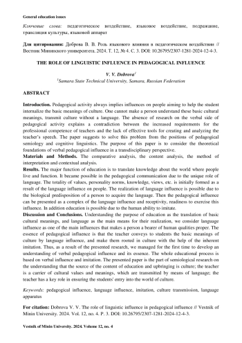 ДОБРОВА В. В. РОЛЬ ЯЗЫКОВОГО ВЛИЯНИЯ В ПЕДАГОГИЧЕСКОМ ВОЗДЕЙСТВИИ // ВЕСТНИК МИНИНСКОГО УНИВЕРСИТЕТА. 2024. ТОМ 12, № 4