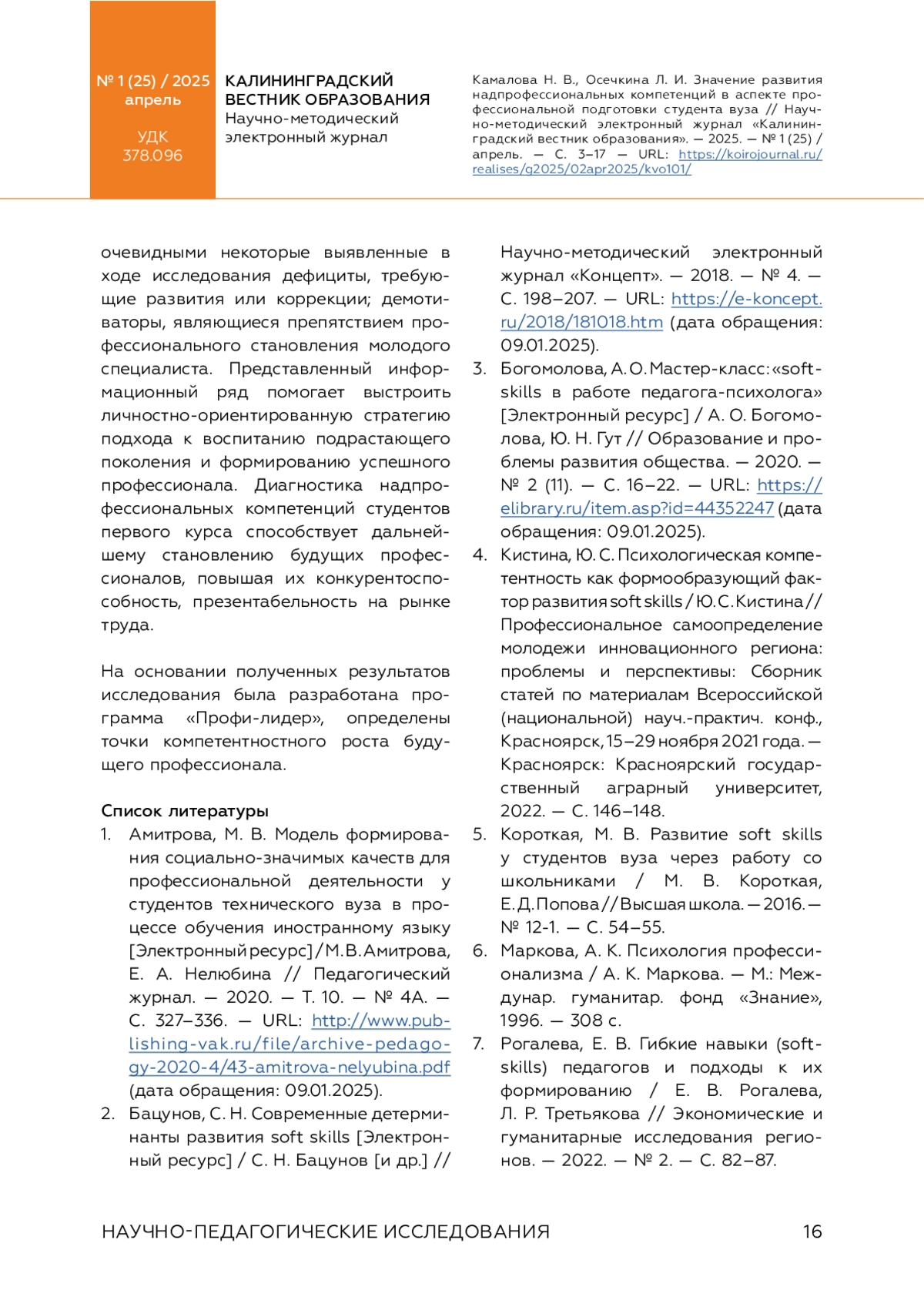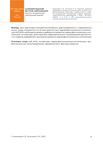 Выводы. Для подготовки конкурентоспособного, адаптированного к современному рынку труда специалиста на основе диагностики надпрофессиональных компетенций soft skills необходимо выявить дефициты в развитии надпрофессиональных компетенций, мотиваторы, демотиваторы образовательной и развивающей деятельности студента; разработать программу развития надпрофессиональных компетенций.