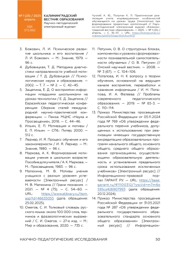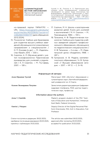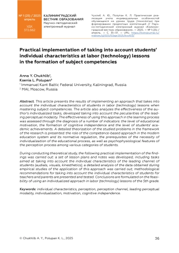 ЧУХЛИБ А. Ю., ПОЛУПАН К. Л. ПРАКТИЧЕСКАЯ РЕАЛИЗАЦИЯ УЧЕТА ИНДИВИДУАЛЬНЫХ ОСОБЕННОСТЕЙ ОБУЧАЮЩИХСЯ НА УРОКАХ ТРУДА (ТЕХНОЛОГИИ) ПРИ ФОРМИРОВАНИИ ПРЕДМЕТНЫХ КОМПЕТЕНЦИЙ // КАЛИНИНГРАДСКИЙ ВЕСТНИК ОБРАЗОВАНИЯ. 2025. № 1 (25)