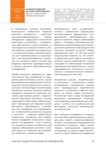 Статья: Практическая реализация учета индивидуальных особенностей обучающихся на уроках труда (технологии) при формировании предметных компетенций (2025)