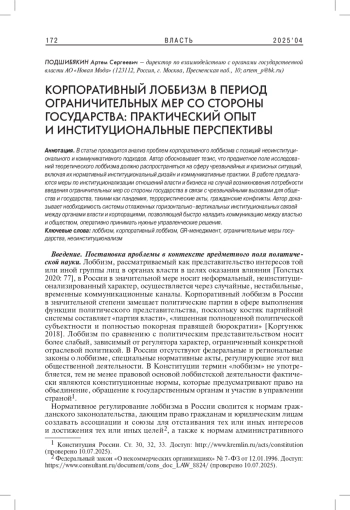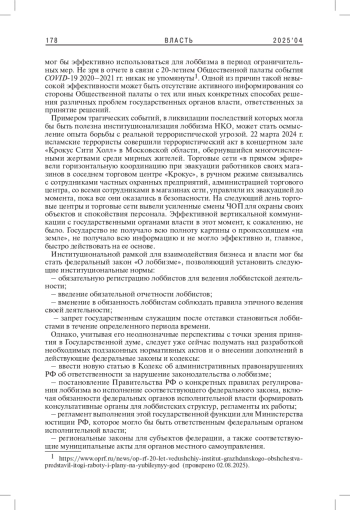 Лоббизм, рассматриваемый как представительство интересов той или иной группы лиц в органах власти в целях оказания влияния [Толстых 2020: 77], в России в значительной мере носит неформальный, неинституционализированный характер, осуществляется через случайные, нестабильные, временные коммуникационные каналы.