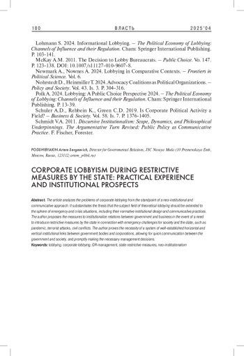 В статье проводится анализ проблем корпоративного лоббизма с позиций неоинституционального и коммуникативного подходов. Автор обосновывает тезис, что предметное поле исследований теоретического лоббизма должно распространяться на сферу чрезвычайных и кризисных ситуаций, включая их нормативный институциональный дизайн и коммуникативные практики. В работе предлагаются меры по институционализации отношений власти и бизнеса на случай возникновения потребности введения ограничительных мер со стороны государства в связи с чрезвычайными вызовами для общества и государства, такими как пандемия, террористические акты, гражданские конфликты. Автор доказывает необходимость системы отлаженных горизонтально-вертикальных институциональных связей между органами власти и корпорациями, позволяющей быстро наладить коммуникацию между властью и обществом, оперативно принимать нужные управленческие решения.