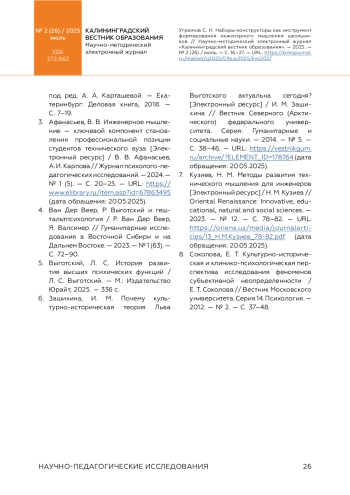 6. Зашихина, И. М. Почему культурно-историческая теория Льва Выготского актуальна сегодня? [Электронный ресурс] / И. М. Зашихина // Вестник Северного (Арктического) федерального университета. Серия: Гуманитарные и социальные науки. - 2014. - № 5. - С. 38-46. - URL: https://vestnikgum.ru/archive/?ELEMENT_ID=178764 (дата обращения: 20.05.2025).