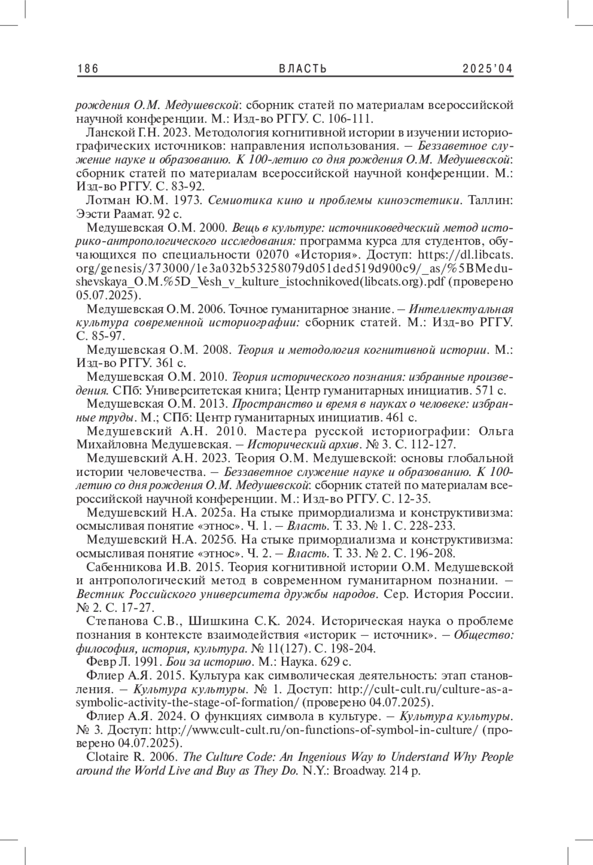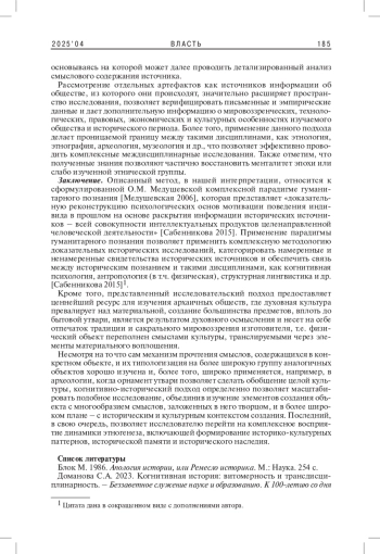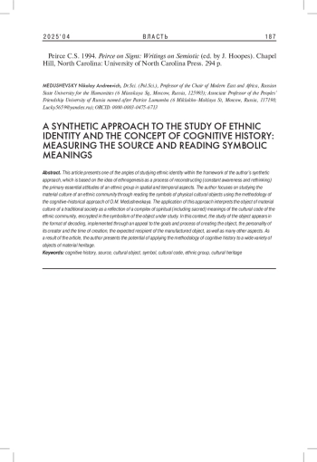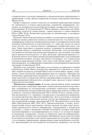 МЕДУШЕВСКИЙ Н. А. СИНТЕТИЧЕСКИЙ ПОДХОД К ИЗУЧЕНИЮ ЭТНИЧЕСКОЙ ИДЕНТИЧНОСТИ И КОНЦЕПЦИЯ КОГНИТИВНОЙ ИСТОРИИ: ИЗМЕРЕНИЕ ИСТОЧНИКА И ПРОЧТЕНИЕ СИМВОЛИЧЕСКИХ СМЫСЛОВ // ВЛАСТЬ. 2025. ТОМ 33 № 4