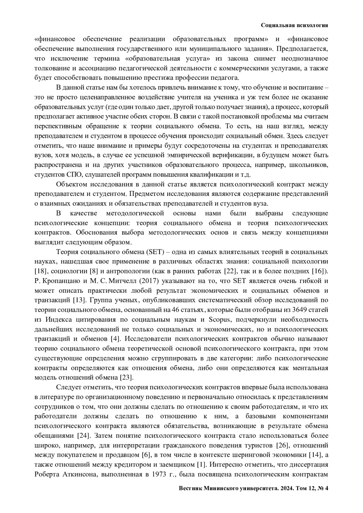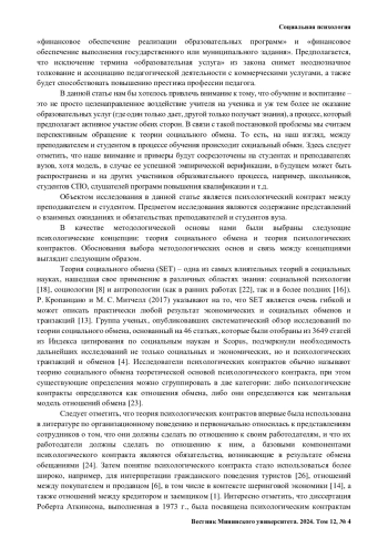 Материалы и методы. Статья представляет собой теоретическое исследование отношений социального обмена между преподавателем и студентом. В качестве методологической основы используются теория социального обмена и теория психологического контракта. База исследования – отечественные и зарубежные публикации, размещенные в базах данных РИНЦ, Science Direct, Willey.