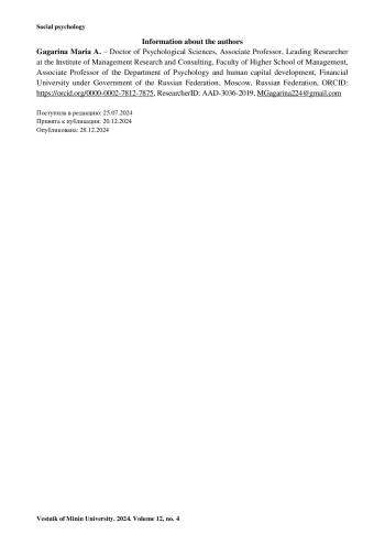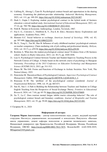 1. Гагарина М. А., Рябов В. Б. Исследование содержания долгового психологического контракта // Вестник Московского государственного областного университета. Серия: Психологические науки. 2022. № 2. С. 60-78.