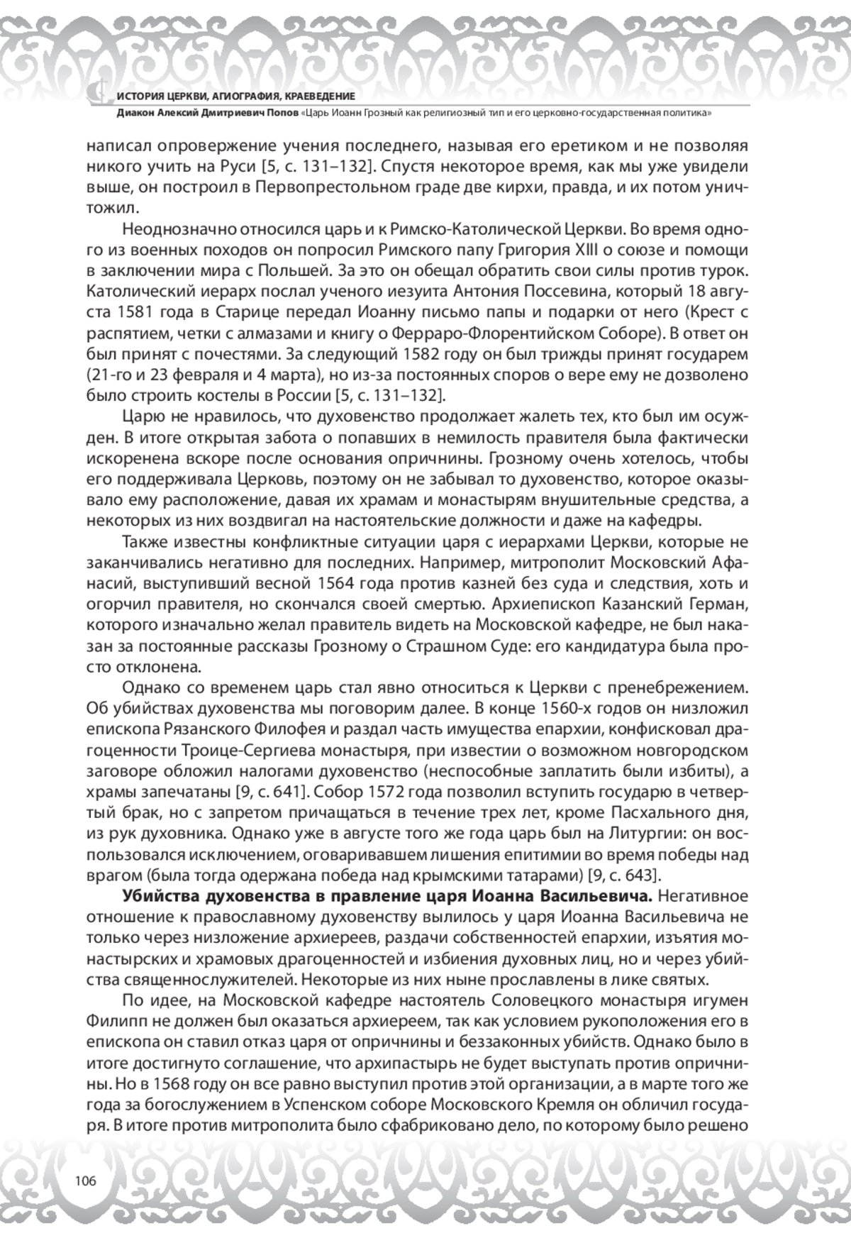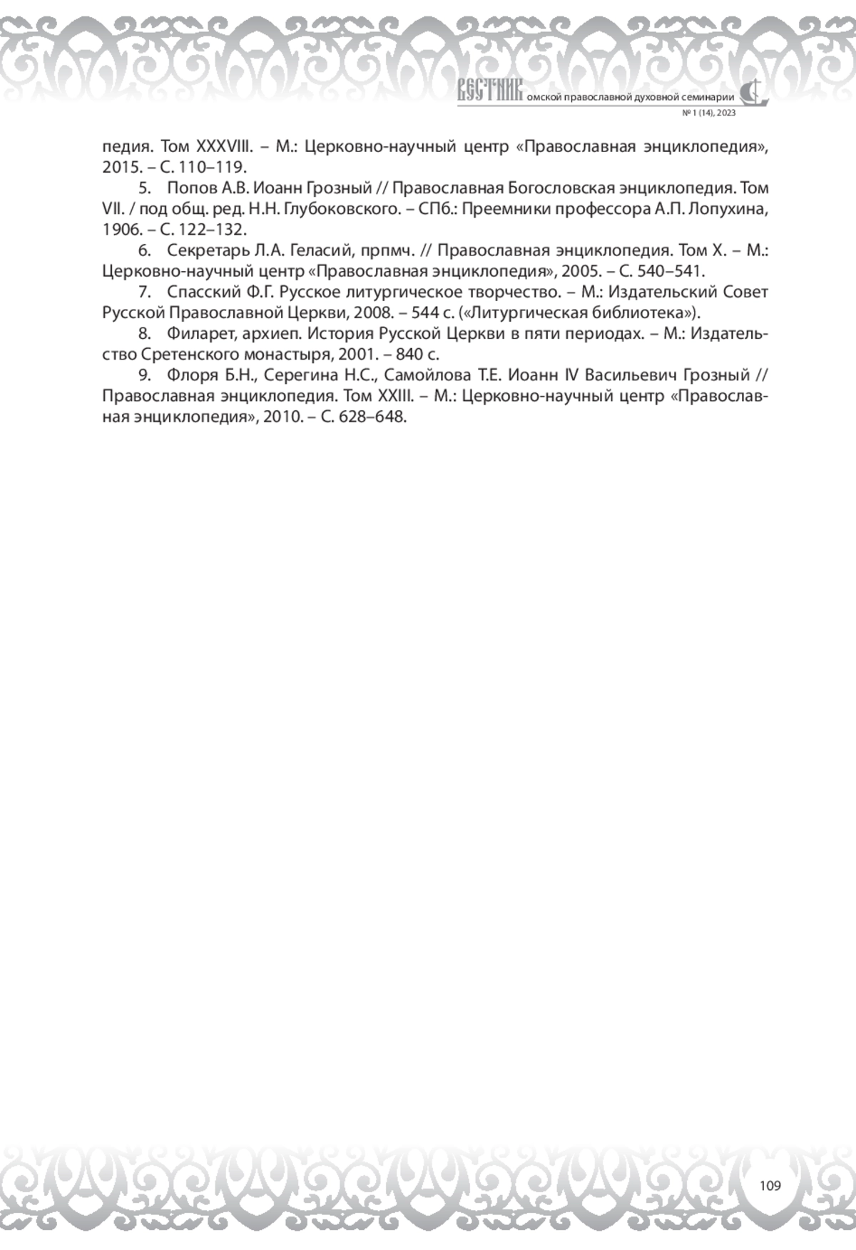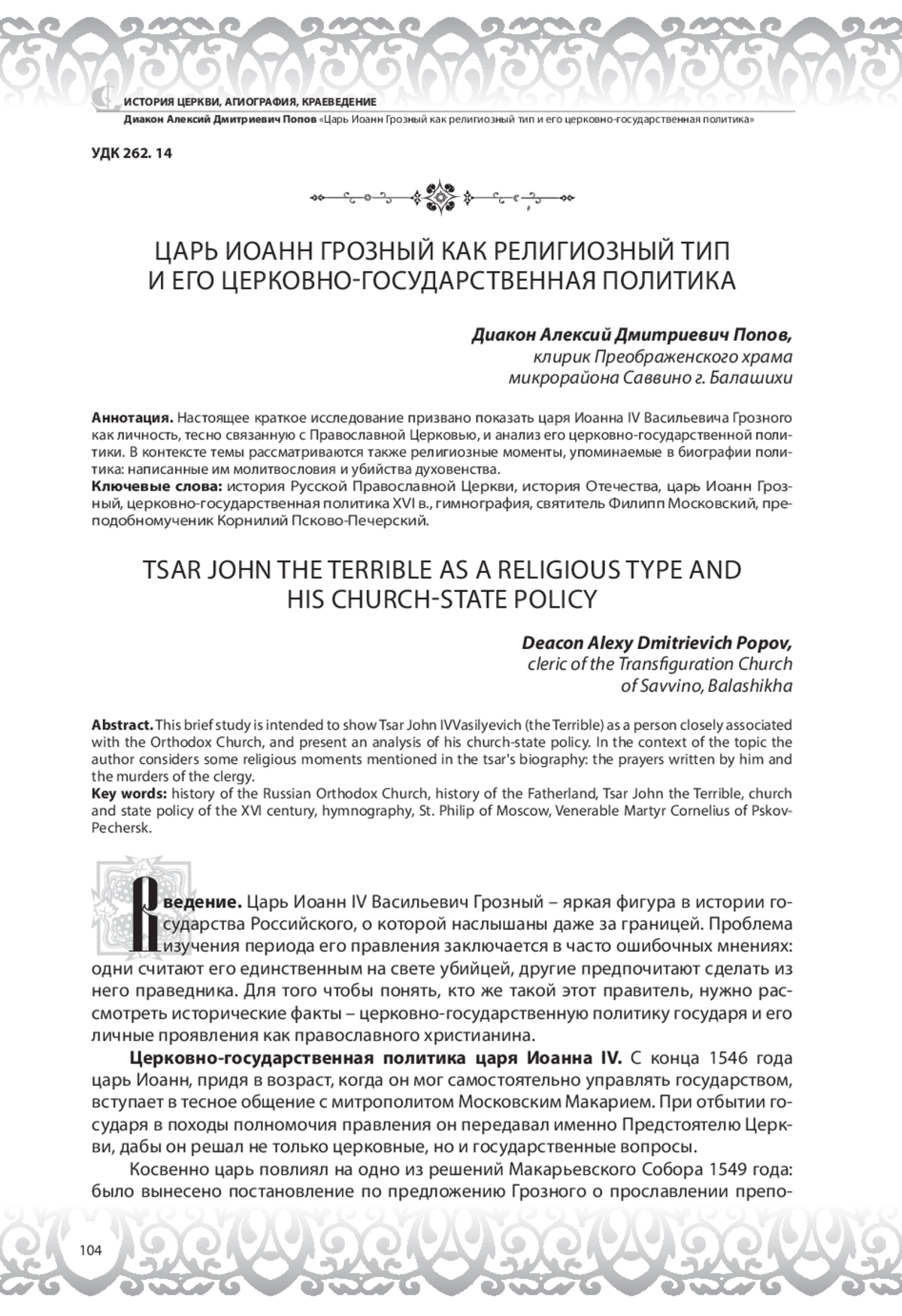 Попов А.Д., диак. Царь Иоанн Грозный как религиозный тип и его церковно-государственная политика // Вестник Омской православной духовной семинарии. - 2023. - №1 (14). - С.104-109.
