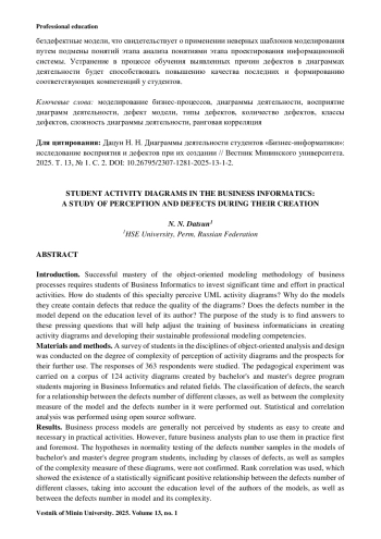 Введение. Успешное освоение методологии объектно ориентированного моделирования бизнес-процессов требует от обучающихся «Бизнес-информатики» значительных временных затрат и усилий в практической деятельности. Как студенты этой специальности воспринимают диаграммы деятельности языка UML? Почему созданные ими модели содержат дефекты, которые снижают качество диаграмм? Зависит ли количество дефектов модели от уровня образования ее автора? Может ли сложность моделей влиять на их качество? Цель исследования – найти ответы на эти актуальные вопросы, которые помогут скорректировать обучение бизнес-информатиков созданию диаграмм деятельности и направить его на развитие у них устойчивых профессиональных компетенций моделирования. Материалы и методы. Выполнен опрос обучающихся на дисциплинах объектно ориентированного анализа и проектирования о степени сложности восприятия диаграмм деятельности и перспектив их дальнейшего использования. Изучены ответы 363 респондентов. Педагогический эксперимент проведен на корпусе из 124 диаграмм деятельности, созданных студентами бакалавриата и магистратуры специальности «Бизнес-информатика» и близкой к ней. Выполнены классификация дефектов, поиск связи между количеством дефектов различных классов, а также между мерой сложности модели и количеством дефектов в ней. Использован статистический и корреляционный анализ, выполненный с помощью открытого программного обеспечения. Результаты исследования. Модели бизнес-процессов в целом не воспринимаются обучающимися как простые для создания и необходимые в практической деятельности. Однако будущие бизнес-аналитики планируют использовать их на практике в первую очередь. Не были подтверждены гипотезы о нормальности распределений выборок количества дефектов в моделях студентов бакалавриата и магистратуры, в том числе по классам дефектов, а также у выборок меры сложности этих диаграмм. Использована ранговая корреляция, которая показала существование статистической значимой положительной связи между количеством дефектов различных классов с учетом уровня образования авторов моделей, а также между количеством дефектов модели и ее сложностью. Обсуждение и заключения. Обработка данных опроса показала, что обучающиеся воспринимают диаграммы деятельности как непростой вид моделей, а бизнес-информатики понимают их важность в аналитической работе. Студенты бакалавриата и магистратуры испытывают похожие трудности при создании моделей бизнес-процессов. Выявлен элемент диаграмм деятельности, который является основным источником дефектов. Студенты магистратуры с образованием «Бакалавр бизнес-информатики» не смогли создать бездефектные модели, что свидетельствует о применении неверных шаблонов моделирования путем подмены понятий этапа анализа понятиями этапа проектирования информационной системы. Устранение в процессе обучения выявленных причин дефектов в диаграммах деятельности будет способствовать повышению качества последних и формированию соответствующих компетенций у студентов.