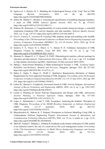 19. Elekes M., Molnár V., Micskei Z. Assessing the specification of modelling language semantics: a study on UML PSSM // Software Quality Journal. 2023. No. 31. Pp. 575-617. https://doi.org/10.1007/s11219-023-09617-5.