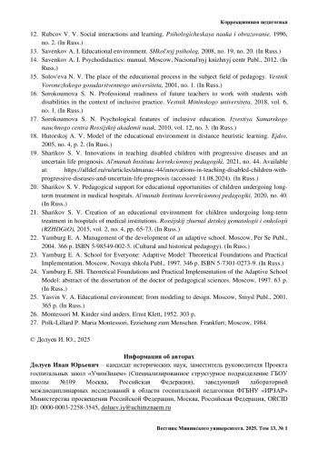 Ключевые фразы: ДЕТИ, нуждающиеся в длительном лечении, российская модель госпитальной школы, образовательно-реабилитационная среда обучения и воспитания, госпитальная педагогика, проект «учимзнаем»