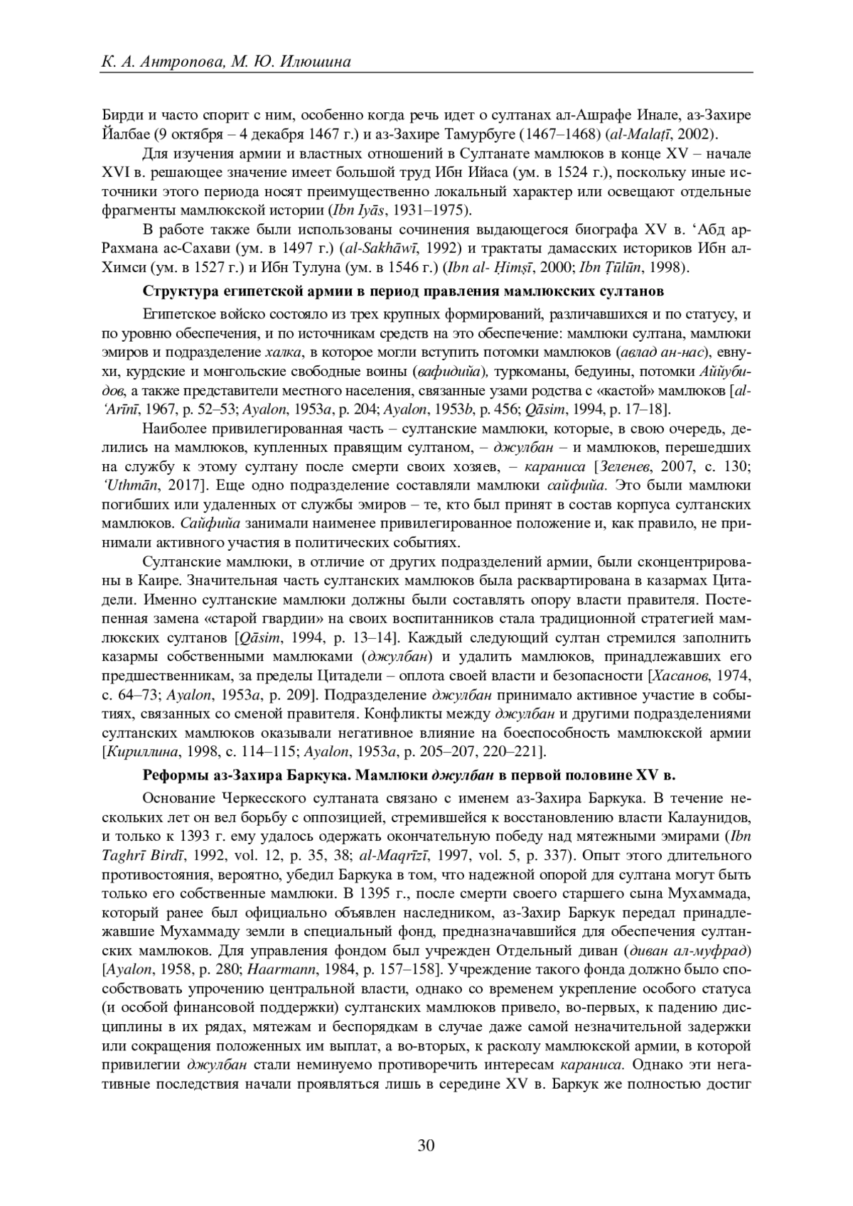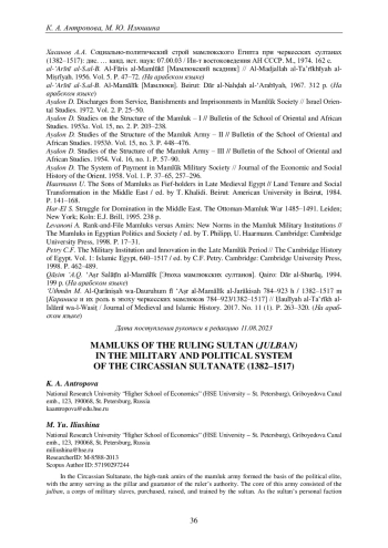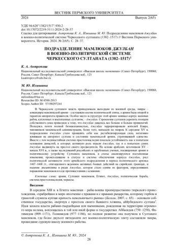 АНТРОПОВА К. А., ИЛЮШИНА М. Ю. ПОДРАЗДЕЛЕНИЕ МАМЛЮКОВ ДЖУЛБАН В ВОЕННО-ПОЛИТИЧЕСКОЙ СИСТЕМЕ ЧЕРКЕССКОГО СУЛТАНАТА (1382-1517) // ВЕСТНИК ПЕРМСКОГО УНИВЕРСИТЕТА. ИСТОРИЯ. 2024. № 2 (65)