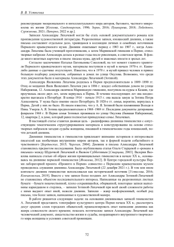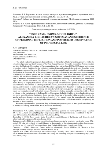 УСТЮГОВА В. В. "ВИЖУ КАМУ, СНЕГА, ЛУННЫЙ СВЕТ…": ЗАПИСКИ АЛЕКСАНДРЫ ЛИХАЧЕВОЙ КАК ОПЫТ ЛИЧНОЙ РЕФЛЕКСИИ И ПОЭТИЗИРОВАННОГО НАБЛЮДЕНИЯ ЖИЗНИ ПРОВИНЦИИ // ВЕСТНИК ПЕРМСКОГО УНИВЕРСИТЕТА. ИСТОРИЯ. 2024. № 2 (65)