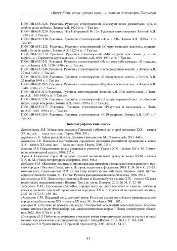 Ключевые фразы: эго-документы, гимназический дневник, самоописательные практики, жанр записок, поэтическая рефлексия, пермь начала хх в, мещанское городское сословие, городской досуг, провинция советских лет, индивидуальность