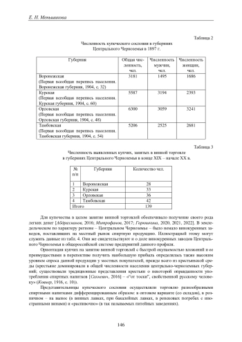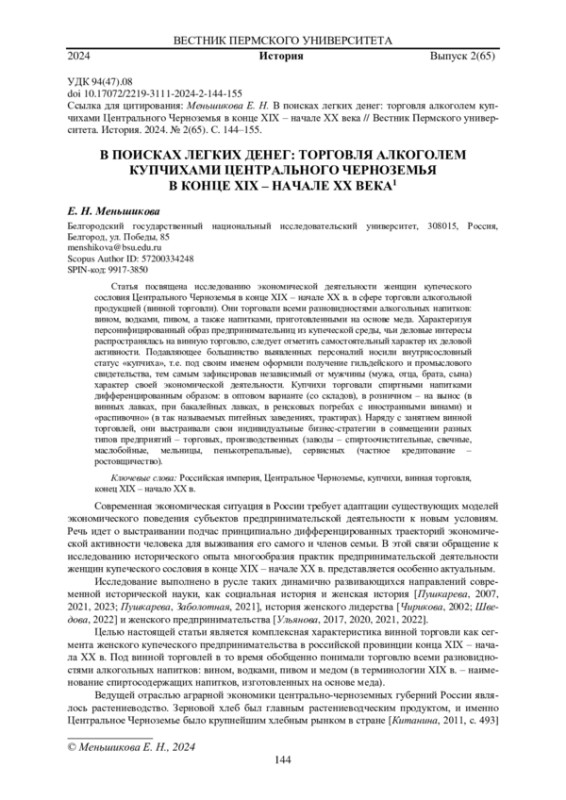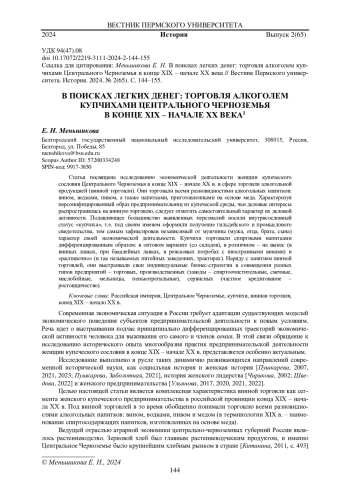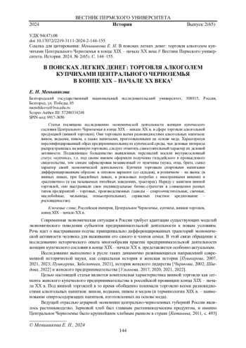 МЕНЬШИКОВА Е. Н. В ПОИСКАХ ЛЕГКИХ ДЕНЕГ: ТОРГОВЛЯ АЛКОГОЛЕМ КУПЧИХАМИ ЦЕНТРАЛЬНОГО ЧЕРНОЗЕМЬЯ В КОНЦЕ XIX - НАЧАЛЕ XX ВЕКА // ВЕСТНИК ПЕРМСКОГО УНИВЕРСИТЕТА. ИСТОРИЯ. 2024. № 2 (65)