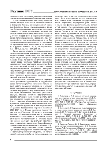 2. Зинченко Е. В. Социальная тревога российского студенчества: территориальный аспект / Е. В. Зинченко, В. И. Филоненко, Л. С. Деточенко, В. Д. Вороная // Научный результат. Социология и управление.-2024.-Т. 10, №3.-С. 133-149.-URL: https://rrsociology.ru/journal/article/3534/(дата обращения: 15.11.2024). DOI: 10.18413/2408-9338-202410-3-0-9 EDN: BUPUIE