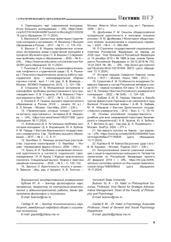 11. Ендовицкий Д. А. Актуальные проблемы воспитания молодежи / Д. А. Ендовицкий, Ю. А. Бубнов, К. М. Гайдар // Вестник Воронежского государственного университета. Сер.: Проблемы высшего образования. - 2017. -№ 2. - С. 5-11.