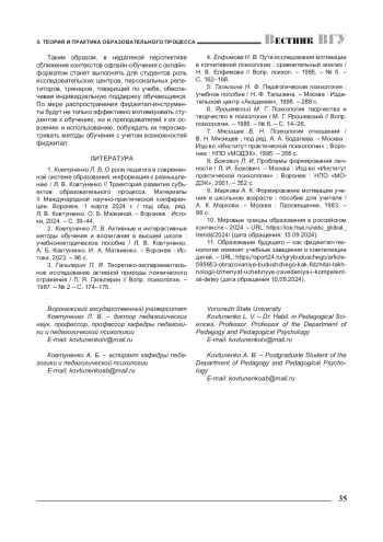 1. Ковтуненко Л. В. О роли педагога в современной системе образования: информация к размышлению / Л. В. Ковтуненко // Траектория развития субъектов образовательного процесса. Материалы II Международной научно-практической конференции, Воронеж, 1 марта 2024 г. / под общ. ред. Л. В. Ковтуненко, О. Б. Мазкиной. - Воронеж: Истоки,2024.-С. 39-44. EDN: ZSCCIU
