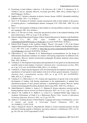 40. Terceño E. M., Greca I., Olalla-Mariscal G., Ojeda M. The participation of deaf and hard of hearing children in non-formal science activities // Frontiers in Education. 2023. Vol. 8. P. 1084373. https://doi.org/10.3389/feduc.2023.1084373.