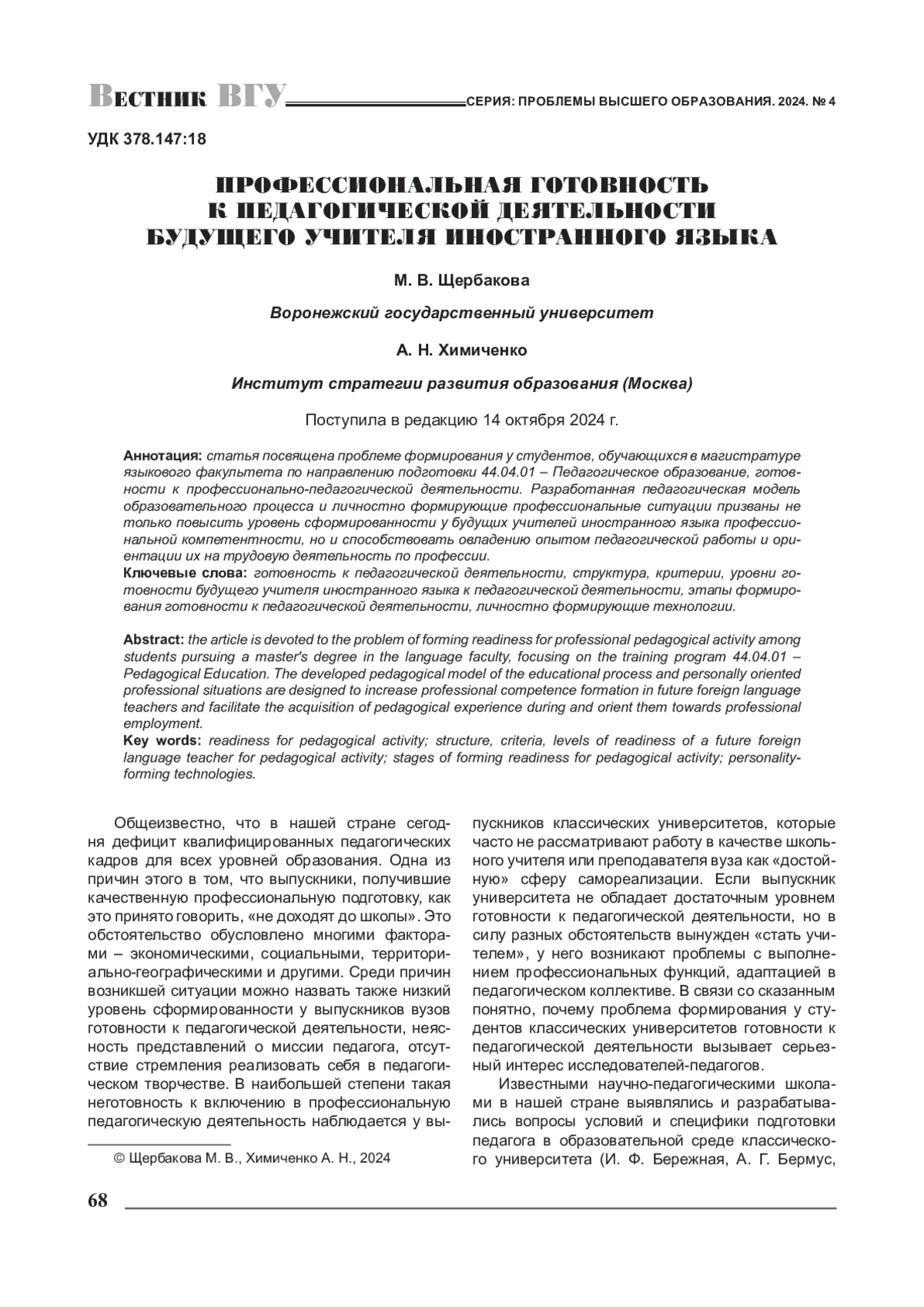 8. Щербакова М. В. Профессионально-модели-рующие ситуации как средство формирования готовности будущего преподавателя иностранного языка к педагогической деятельности / М. В. Щербакова, И. В. Домбровская, А. Н. Химиченко // Вестник Воронежского государственного университета. Сер.: Проблемы высшего образования. - 2023. - № 4. - C.90-94.