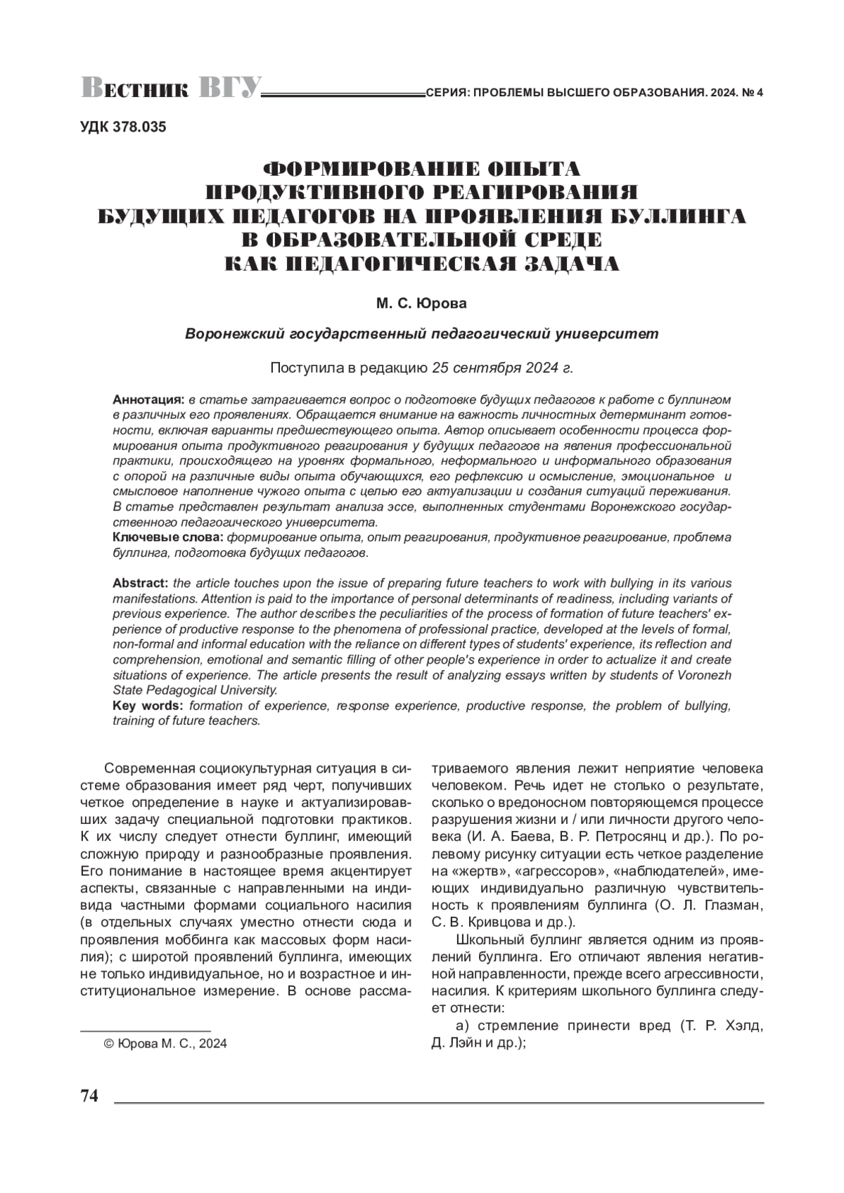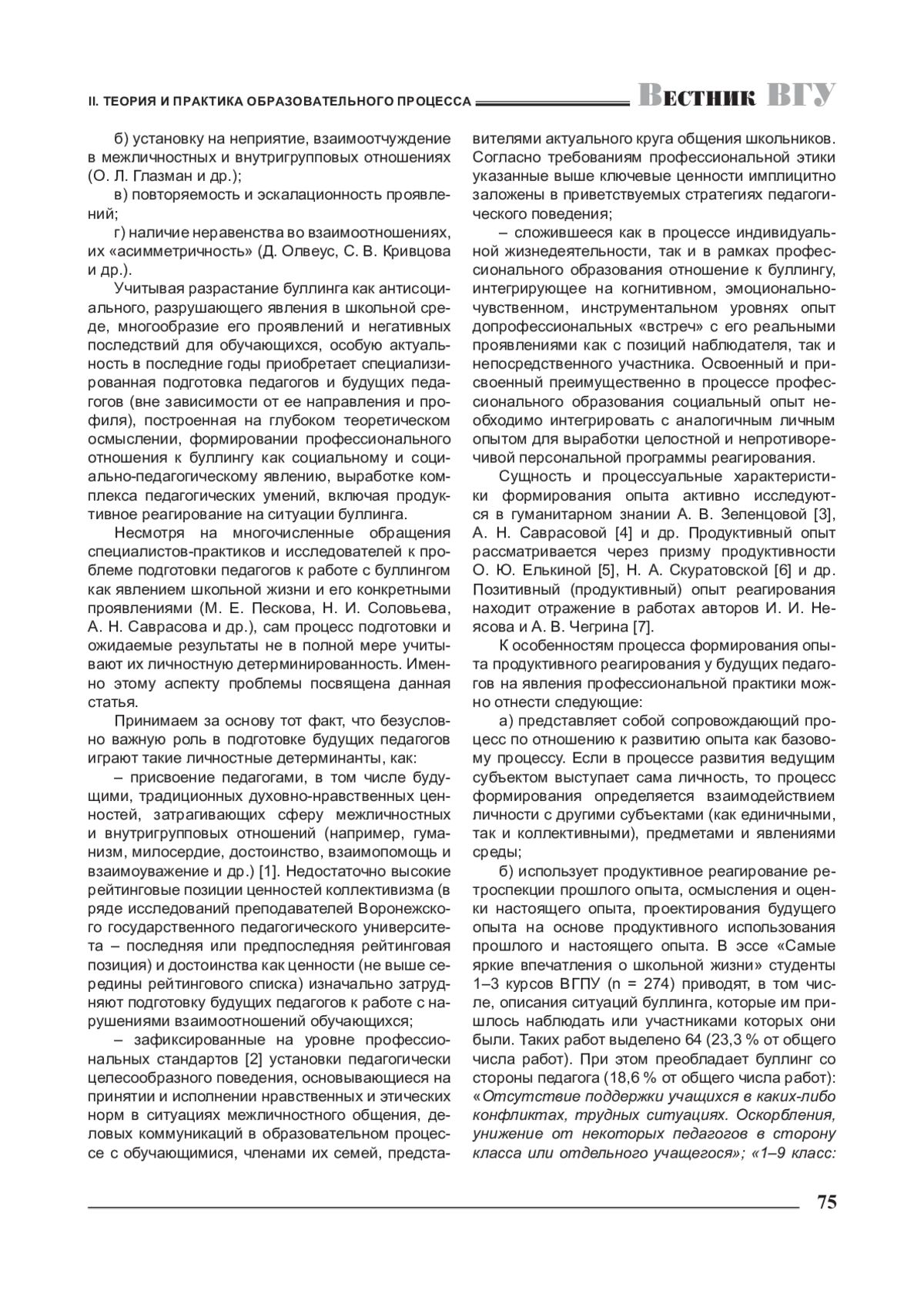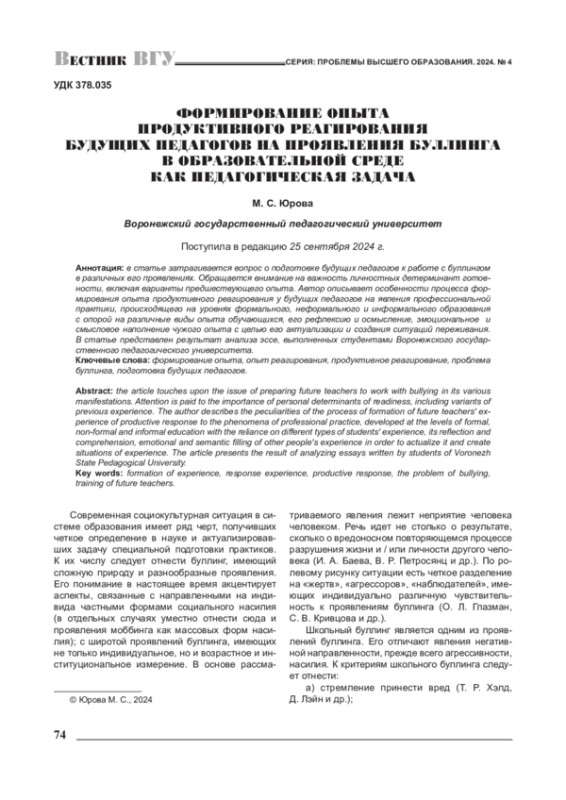 В статье затрагивается вопрос о подготовке будущих педагогов к работе с буллингом в различных его проявлениях. Обращается внимание на важность личностных детерминант готовности, включая варианты предшествующего опыта. Автор описывает особенности процесса формирования опыта продуктивного реагирования у будущих педагогов на явления профессиональной практики, происходящего на уровнях формального, неформального и информального образования с опорой на различные виды опыта обучающихся, его рефлексию и осмысление, эмоциональное и смысловое наполнение чужого опыта с целью его актуализации и создания ситуаций переживания. В статье представлен результат анализа эссе, выполненных студентами Воронежского государственного педагогического университета.
