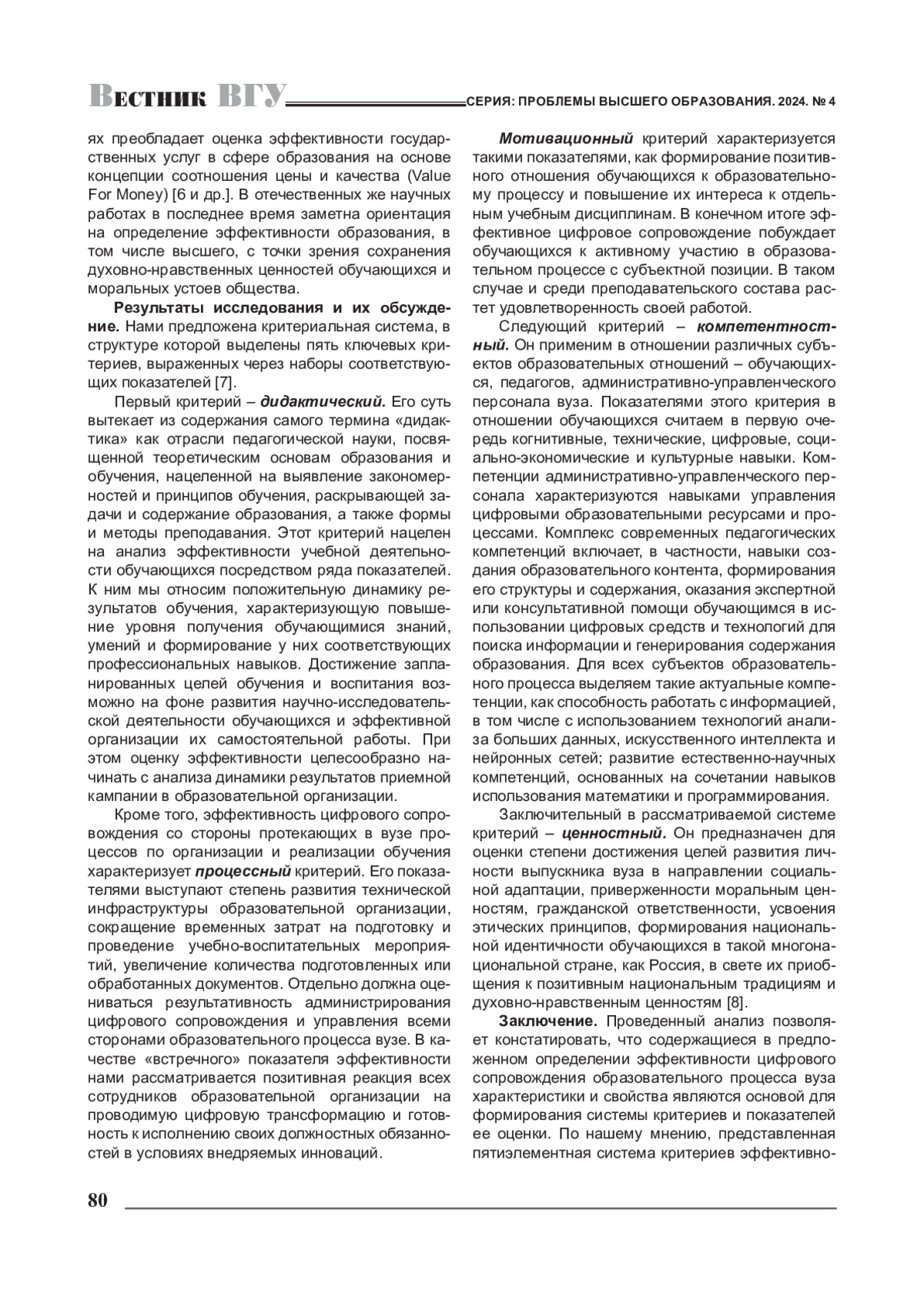 Оценка эффективности цифровых инструментов в образовании требует научно обоснованного подхода и должна проводиться по четко определенным критериям. Настоящее исследование направлено на разработку комплекса критериев для оценки эффективности цифрового сопровождения образования в вузе, обеспечивающих оптимальное достижение его целей. Результатом исследования стала пятиэлементная система критериев, позволяющая осуществлять мониторинг и оценку эффективности цифрового сопровождения вузовского образования с целью анализа и поддержания последнего на должном уровне, обеспечения его соответствия потребностям обучающихся и преподавателей.