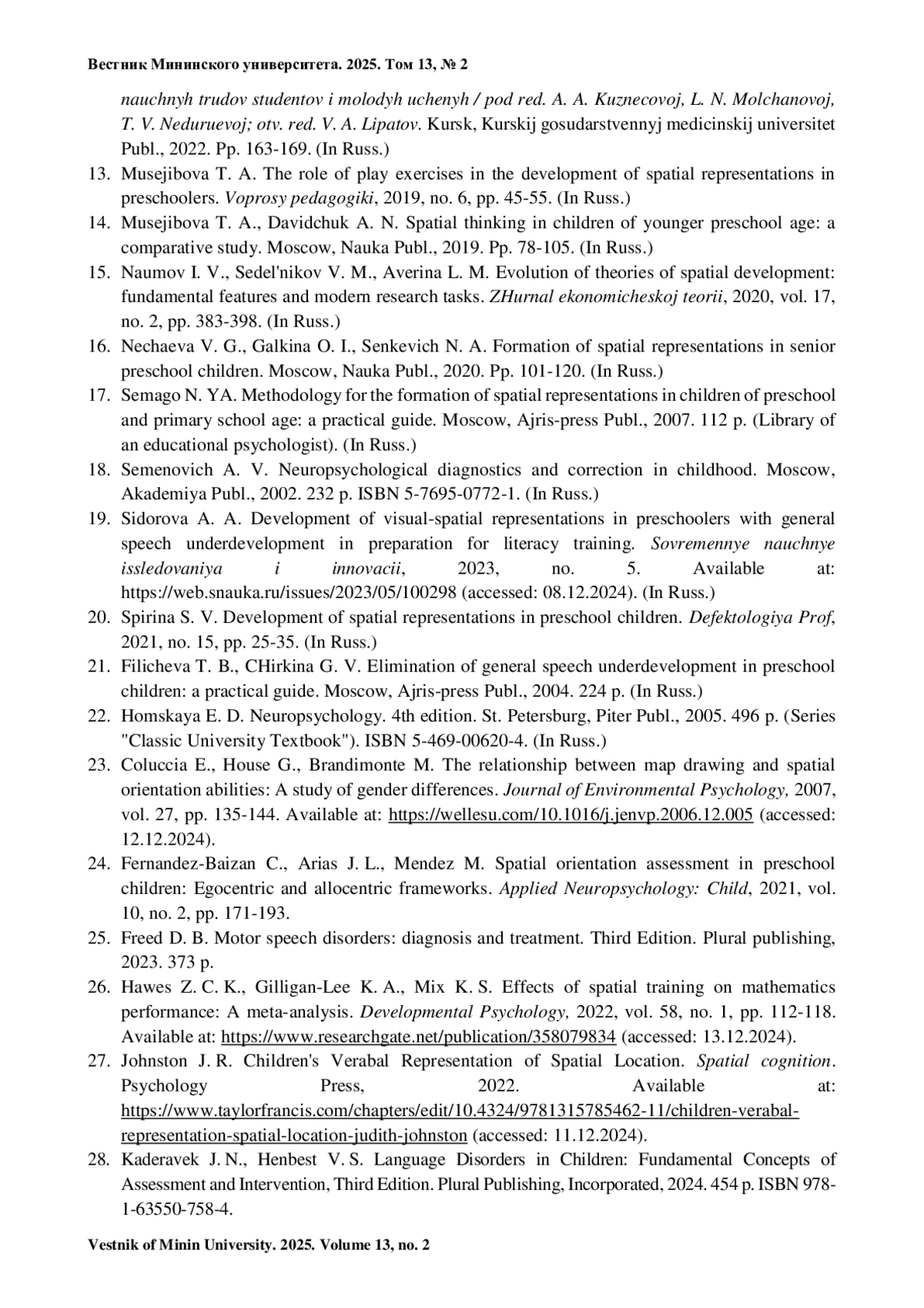 11. Медведева Е. Ю., Ольхина Е. А. К вопросу о коррекции и развитии пространственных представлений у дошкольников с ОНР // Балтийский гуманитарный журнал. 2019. Т. 8, № 3 (28). С. 89-92.