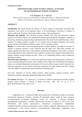 14. Кулагина И. Ю., Апасова Е. В. Позиции по отношению к учебной деятельности в младшем школьном возрасте // Актуальные проблемы психологического знания. 2024. № 4 (69). С. 329-343. https://doi.org/10.51944/20738544_2024_4_329.