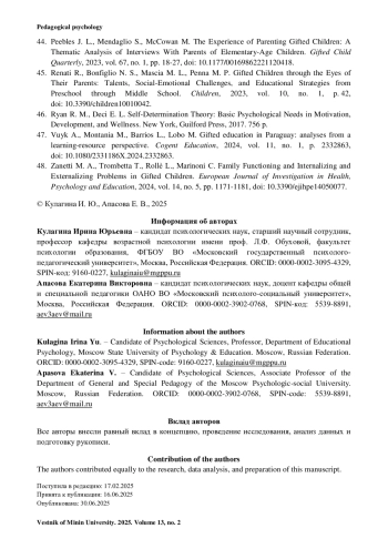 44. Peebles J. L., Mendaglio S., McCowan M. The Experience of Parenting Gifted Children: A Thematic Analysis of Interviews With Parents of Elementary-Age Children // Gifted Child Quarterly. 2023. Vol. 67, no. 1. Рр. 18-27. https://doi.org/10.1177/00169862221120418.