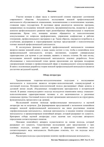 Введение. В настоящее время в нашей стране реализуется множество программ, направленных на поддержку женской занятости и профессионального развития через разнообразные образовательные и творческие инициативы. Исследование женской профессиональной ментальности поможет разработать более обоснованные с психологической точки зрения предложения для программ поддержки самореализации женщин в профессиональной сфере. Цель статьи – разработать понятийный аппарат предметной области женской профессиональной ментальности, которая позволит описать ее с необходимой и достаточной степенью полноты.