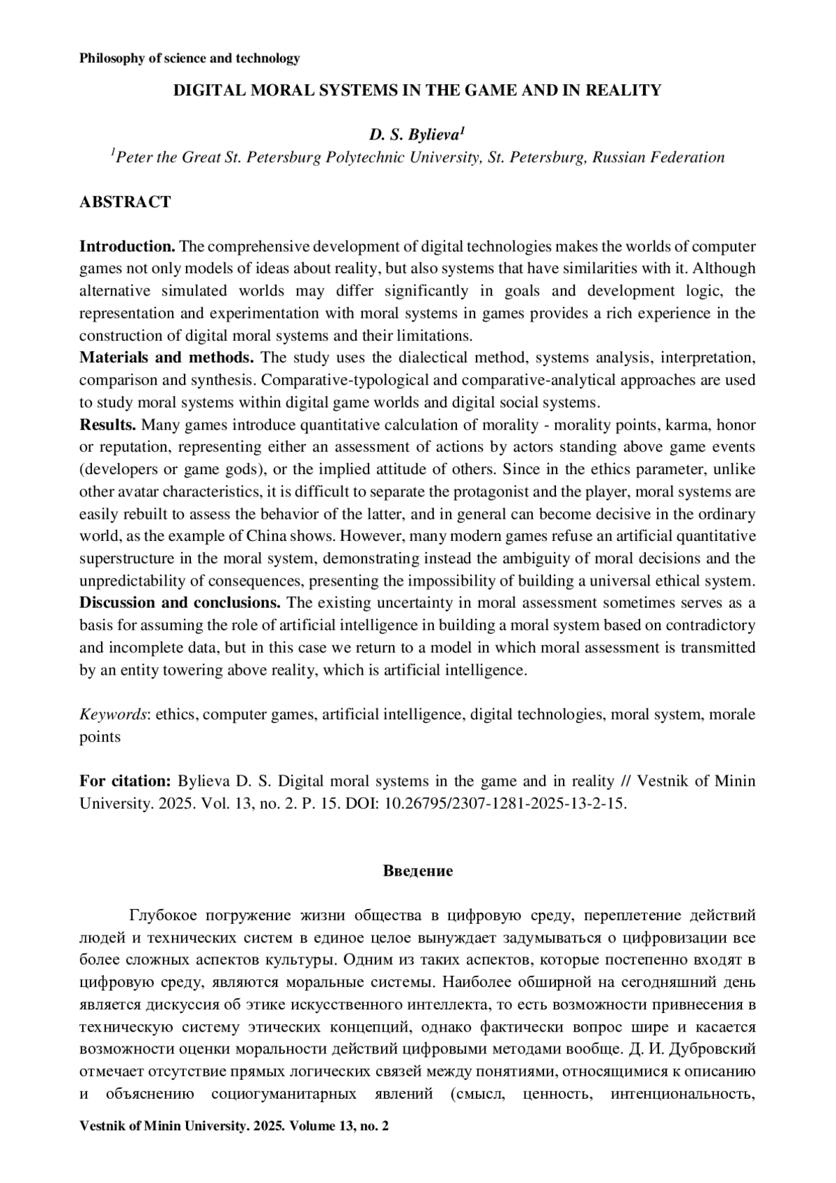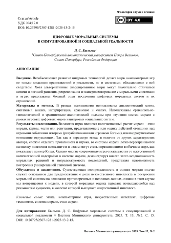 Введение. Всеобъемлющее развитие цифровых технологий делает миры компьютерных игр не только моделями представлений о реальности, но и системами, обладающими с ней сходством. Хотя альтернативные симулированные миры могут значительно отличаться целями и логикой развития, репрезентация и экспериментирование с моральными системами в играх представляет богатый опыт построения цифровых моральных систем и их ограничений.
