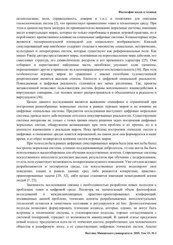 Обсуждение и заключения. Существующая неопределенность в оценке морали подчас служит основанием для предположения о роли искусственного интеллекта в построении моральной системы на основании противоречивых и неполных данных, однако в этом случае мы возвращаемся к модели, в которой моральная оценка передана возвышающейся над реальностью сущности, в качестве которой выступает искусственный интеллект.