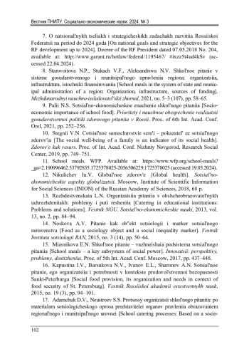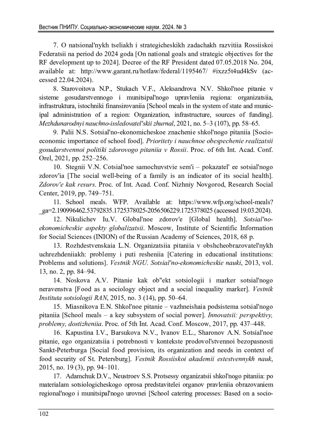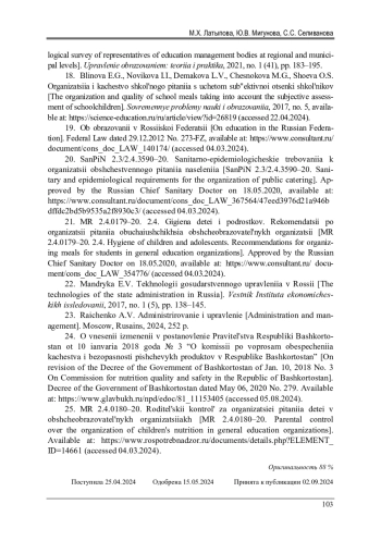 8. Старовойтова, Н.П. Школьное питание в системе государственного и муниципального управления региона: организация, инфраструктура, источники финансирования / Н.П. Старовойтова, В.Ф. Стукач, Н.В. Александрова // Международный научно-исследовательский журнал. - 2021. - № 5-3 (107). - С. 58-65. EDN: TTGPUF