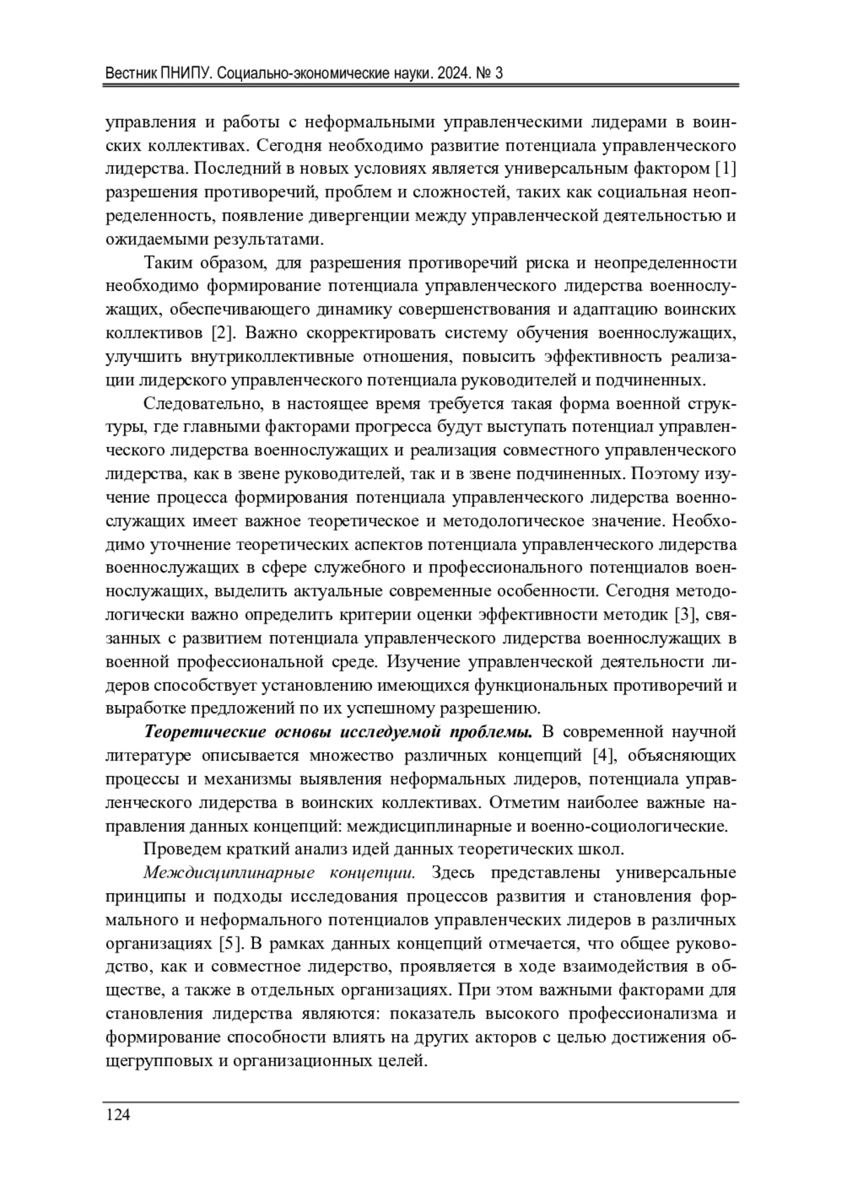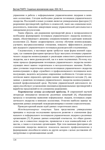 Введение (обозначение проблемы). В современных сложных геополитических условиях, сложившихся в настоящее время вокруг России, подтверждается необходимость совершенствования и адаптации модели военного управления. Практики проведения специальных военных операций показали важность использования новых методов и подходов по идентификации культуры управления и работы с неформальными управленческими лидерами в воинских коллективах. Сегодня необходимо развитие потенциала управленческого лидерства. Последний в новых условиях является универсальным фактором [1] разрешения противоречий, проблем и сложностей, таких как социальная неопределенность, появление дивергенции между управленческой деятельностью и ожидаемыми результатами