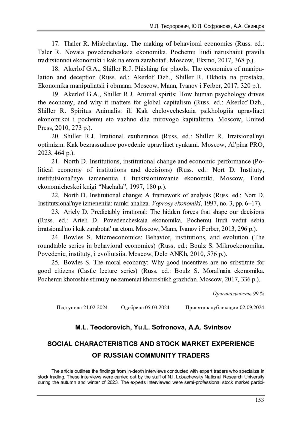 Введение. В российской социологии изучение различных аспектов функционирования фондового рынка и деятельности биржевых игроков началось в двухтысячные годы, наиболее заметными здесь стали работы социолога Д. О. Стребкова. Так, в 2007 г. были представлены результаты социологического анализа фондового рынка [1], также были опубликованы статьи автора, посвященные профессиональным и непрофессиональным игрокам на бирже [2], самоидентификации трейдеров-профессионалов [3]. Свой вклад в социологическое изучение особенностей рынка ценных бумаг вносит экономсоциолог Б. Б. Подгорный, рассматривающий данное пространство в качестве социального и информационного поля [4–7]. Современные отечественные исследователи активно изучают различные аспекты деятельности частных и институциональных инвесторов российского фондового рынка [8, 9].