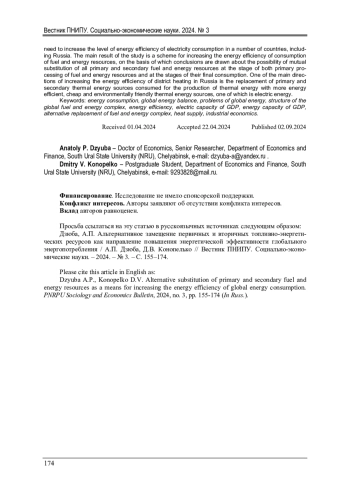 Представлено исследование сравнительных характеристик энергоэффективности потребления ТЭР в странах мира, а также научно обосновано использование альтернативного замещения первичных и вторичных ТЭР в качестве одного из ключевых направлений современной политики повышения эффективности глобального энергопотребления. Проведено исследование структуры выработки электрической энергии в мировых континентах по видам первичного топлива, а также динамики изменения электрической емкости страновых ВВП (по ППС) в странах мира за период 1985-2021 гг., которая отражает существенное различие состава первичных ТЭР, потребляемых для производства электроэнергии странами мира. Показано постепенное снижение уровня энергетической эффективности потребления электроэнергий в мировых континентах и странах. Построена карта энергетической емкости и электрической емкости страновых ВВП (по ППС), отражающая, во-первых, существенный разброс стран мира по уровню энергетической эффективности потребления как электрической энергии, так и общих ТЭР, во-вторых, влияние показателей электрической емкости страновых ВВП (по ППС), так как в доле потребления топливно-энергетических ресурсов каждой страны мира значительная часть ТЭР расходуется на производство именно электрической энергии. Построенная карта выбросов СО2 к ВВП (по ППС) к энергетической емкости страновых ВВП (по ППС) в мире также подчеркивает влияние низкого уровня энергетической эффективности стран на показатели вредных выбросов в экологию, что еще раз подчеркивает необходимость повышения уровня энергетической эффективности потребления электрической энергии в ряде стран, в том числе России. Основным результатом исследования является разработанная авторская схема повышения энергетической эффективности потребления топливно-энергетических ресурсов, на основе которой делаются выводы возможности взаимного замещения всех первичных и вторичных ТЭР, на этапе как первичной переработки ТЭР и на этапах конечного их потребления. Ключевым вектором роста энергоэффективности теплоснабжения в экономике РФ является направление взаимного замещения потребляемых первичных и вторичных ресурсов, используемых на выработку теплоэнергии более эффективными, экономичными и экологичными ресурсами, одним из которых является электроэнергия и мощность.