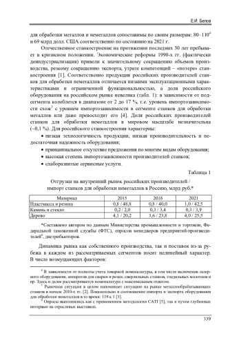Глобальный рынок оборудования для обработки неметаллов непрерывно растет. На фоне различных драйверов потребления средств производства развитие отрасли определяет ограниченное число развитых и новых индустриальных стран. Совокупность рассматриваемых сегментов станкостроения развивается в условиях разнообразия государственных мер поддержки производителей, включая маркетинговые, и разнообразия корпоративных стратегий. При этом трансформация глобальной территориальной и технологической структуры производства оборудования для обработки неметаллов выходит за рамки традиционных представлений о росте доли Китая на мировом рынке, доминировании станкостроительных кластеров и развитии систем числового программного управления. Большое значение имеет расширение сети дистрибьюторов и партнеров, локализация производства, трансфер инноваций (в том числе в рамках транснациональных сделок слияния и поглощения), разнообразие требований со стороны конечных потребителей (особенности в части экономичности и экологичности). В стоимостном исчислении доля отечественных потребителей составляет лишь 0,1 % от мирового производства, поэтому для пребывающего в многолетнем кризисе российского станкостроения изучение международного опыта важно как с точки зрения формирования и последовательного проведения промышленной политики, так и с точки зрения изучения и воспроизводства практик разработки, создания, продвижения продукции на внутреннем и глобальном рынках.