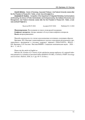 Проведено исследование текущей ситуации на региональном рынке труда Российской Федерации, который переживает существенный кризис, характеризующийся дефицитом кадров во всех отраслях. Компаниям с каждым годом становится сложнее привлекать и удерживать сотрудников, а текучесть кадров растет. Крайне актуальным является вопрос изучения удовлетворенности трудом сотрудников, так как именно удовлетворенность помогает бороться с текучестью кадров, повышать вовлеченность сотрудников и производительность труда. Рассмотрены разные подходы (философский, экономический, психологический, социологический, интегративный) к выделению факторов удовлетворенности трудом. Авторы приходят к выводу, что некоторые из подходов устарели, современная действительность требует актуализации перечня основных групп факторов удовлетворенности трудом. Для формирования более актуального списка факторов авторами с 2010 по 2024 г. было проведено социологическое исследование, включающее следующие процедуры сбора информации: экспертное интервью ( N =24), опрос в форме анкетирования ( N =2226) и три серии фокус-группового опроса. Вопросы для анкетирования были разработаны не только для получения информации об удовлетворенности условиями труда на региональном газотранспортном предприятии, но и для определения факторов, послуживших причинами увольнения. Чтобы управлять персоналом, необходимо следить за удовлетворенностью трудом сотрудников, их вовлеченностью и мотивированностью. Ключевой задачей становится исследование факторов, влияющих на удовлетворенность трудом. На базе полученных данных был составлен актуальный список факторов удовлетворенности трудом, в который вошли: оплата труда; сплоченность трудового коллектива; условия труда; служебная карьера; социальные гарантии и блага, престижность. Данный перечень факторов может стать основой для предприятий в разработке программ исследования удовлетворенности трудом сотрудников, подходов к повышению удовлетворенности трудом.