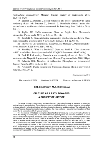 2. Киприянова, М.А. Искажение смыслов культуры в условиях ее технологизации / М.А. Киприянова, С.Н. Смольников // Ученые записки Крымского федерального университета имени ВИ Вернадского. Философия. Политология. Культурология. - 2023. - Т. 9, № 2. - С. 68-80. EDN: XNORQZ