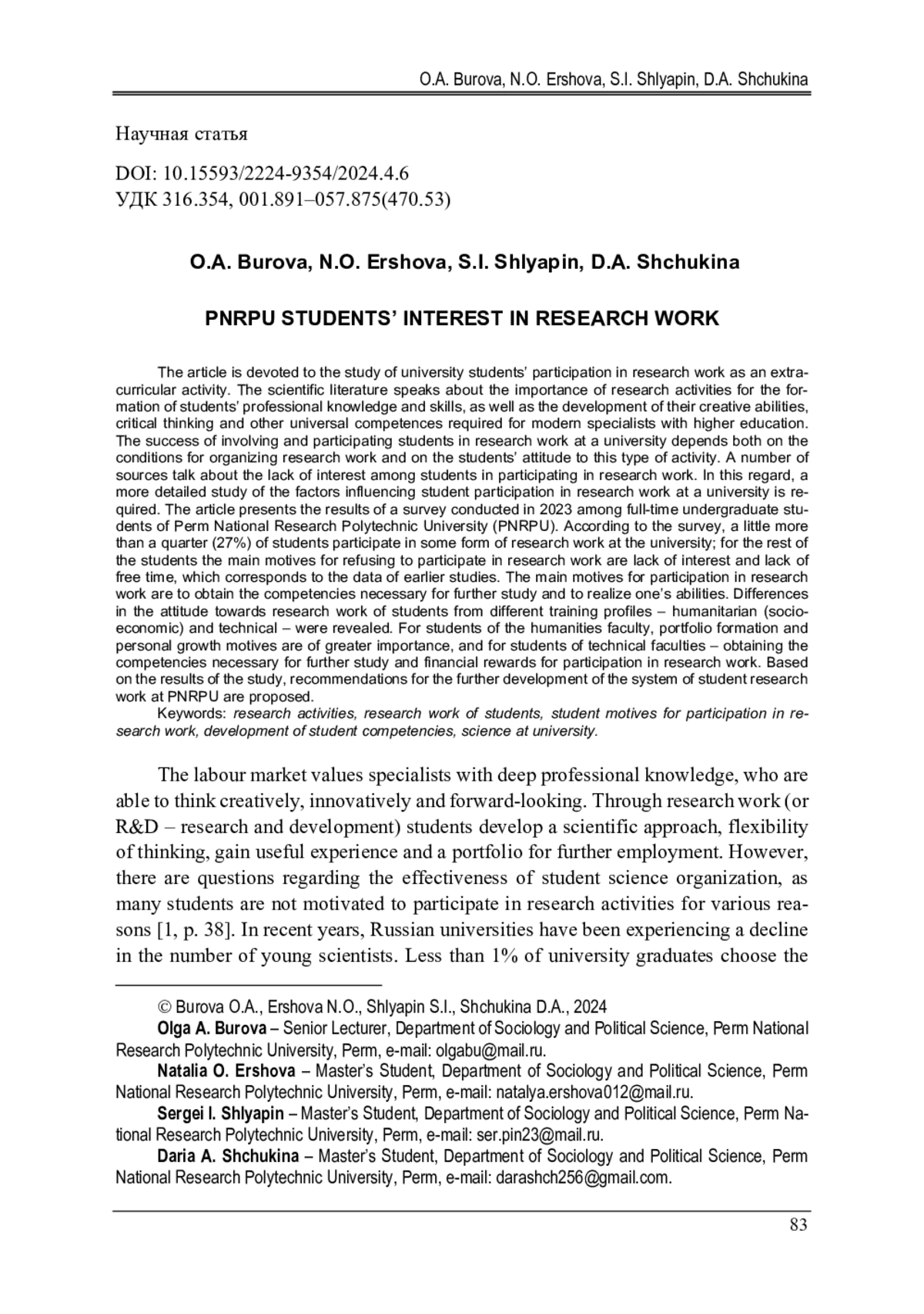 25. Popovich A.E. Samorealizatsiia studentov v nauchno-issledovatel’skoi deiatel’nosti kak professional’naia potrebnost’ [Self-realization of students in scientific research as a professional need]. Pedagogika i psikhologiia obrazovaniia, 2023, no. 2, pp. 44-55.