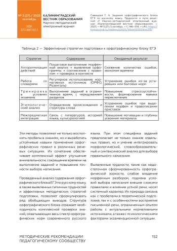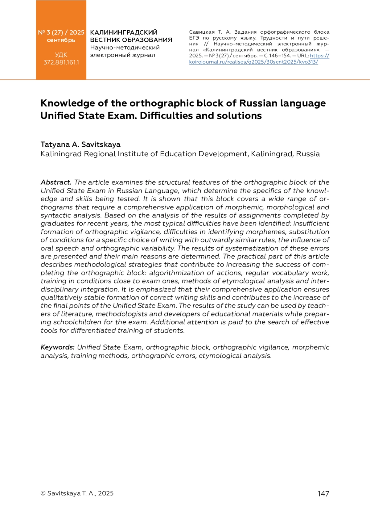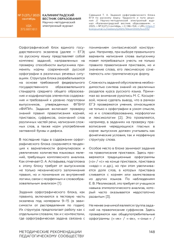 В статье рассматриваются структурные особенности орфографического блока единого государственного экзамена (далее — ЕГЭ) по русскому языку, определяющие специфику проверяемых знаний и умений. Показано, что данный блок охватывает широкий спектр орфограмм, требующих комплексного применения морфемного, морфологического и синтаксического анализа. На основе анализа результатов выполнения заданий выпускниками последних лет выявлены наиболее типичные трудности: недостаточная сформированность орфографической зоркости, затруднения при выделении морфем, подмена условий конкретного выбора написания внешне схожими правилами, влияние устной речи и орфографической вариативности. Представлены результаты систематизации этих ошибок и определены их основные причины. В практической части статьи описаны методические стратегии, способствующие повышению успешности выполнения орфографического блока: алгоритмизация действий; регулярная словарная работа; тренировка в условиях, приближенных к экзаменационным; приемы этимологического анализа и межпредметная интеграция. Подчеркивается, что их комплексное применение качественно обеспечивает устойчивое формирование навыков правильного письма и способствует повышению итогового балла ЕГЭ. Результаты исследования могут быть использованы учителями-словесниками, методистами и разработчиками обучающих материалов при подготовке школьников к экзамену. Более того, внимание уделено поиску эффективных инструментов дифференцированной подготовки учащихся.