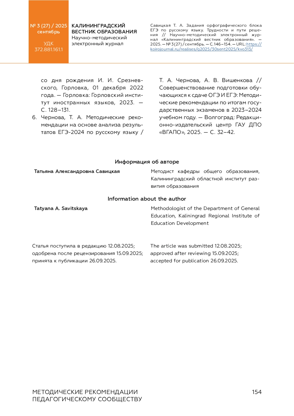 6. Чернова, Т. А. Методические рекомендации на основе анализа результатов ЕГЭ-2024 по русскому языку / Т. А. Чернова, А. В. Вишенкова // Совершенствование подготовки обучающихся к сдаче ОГЭ И ЕГЭ: Методические рекомендации по итогам государственных экзаменов в 2023-2024 учебном году. - Волгоград: Редакционно-издательский центр ГАУ ДПО “ВГАПО”, 2025. - С. 32-42.
