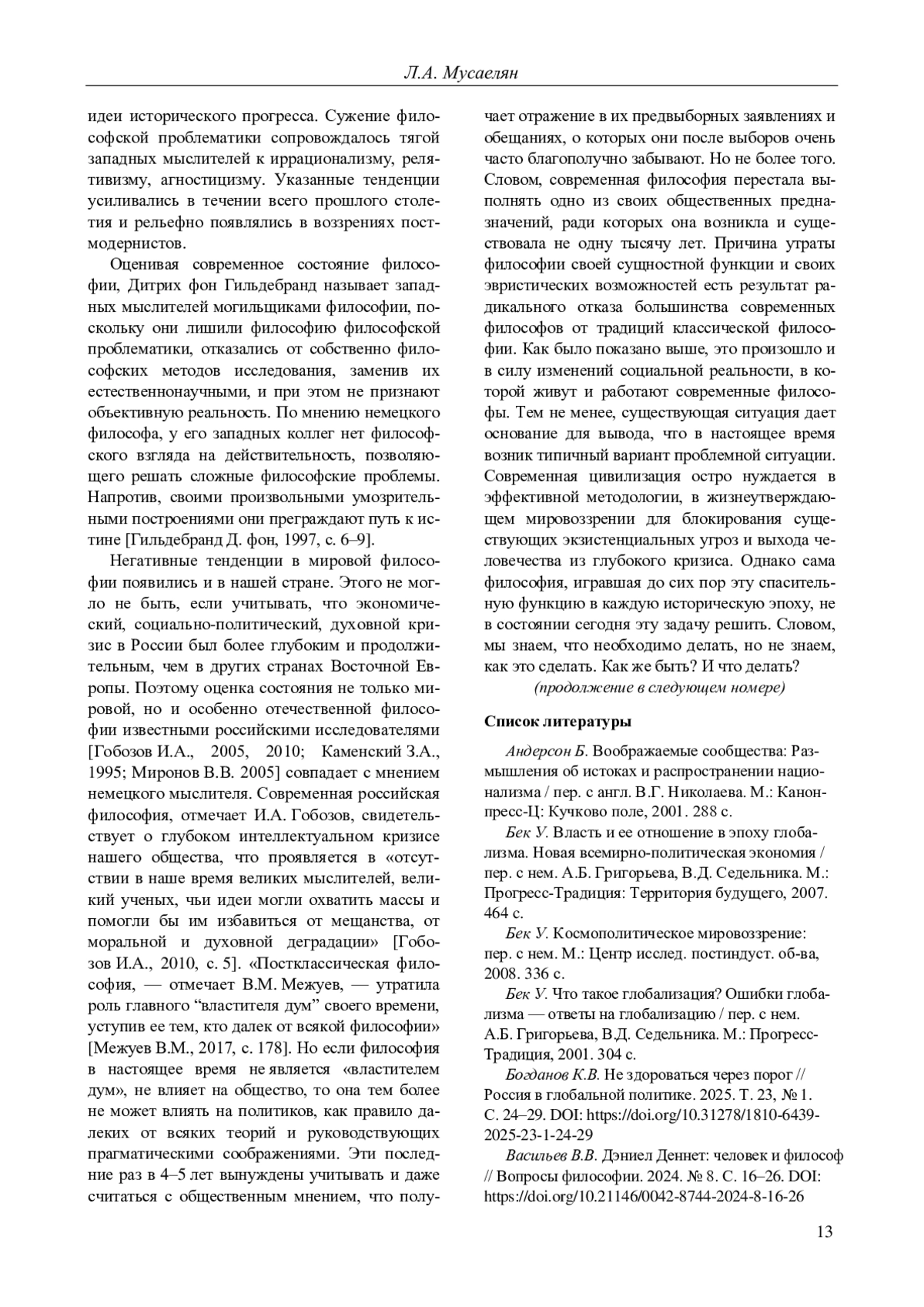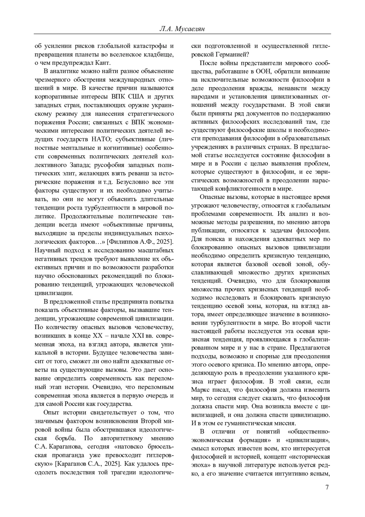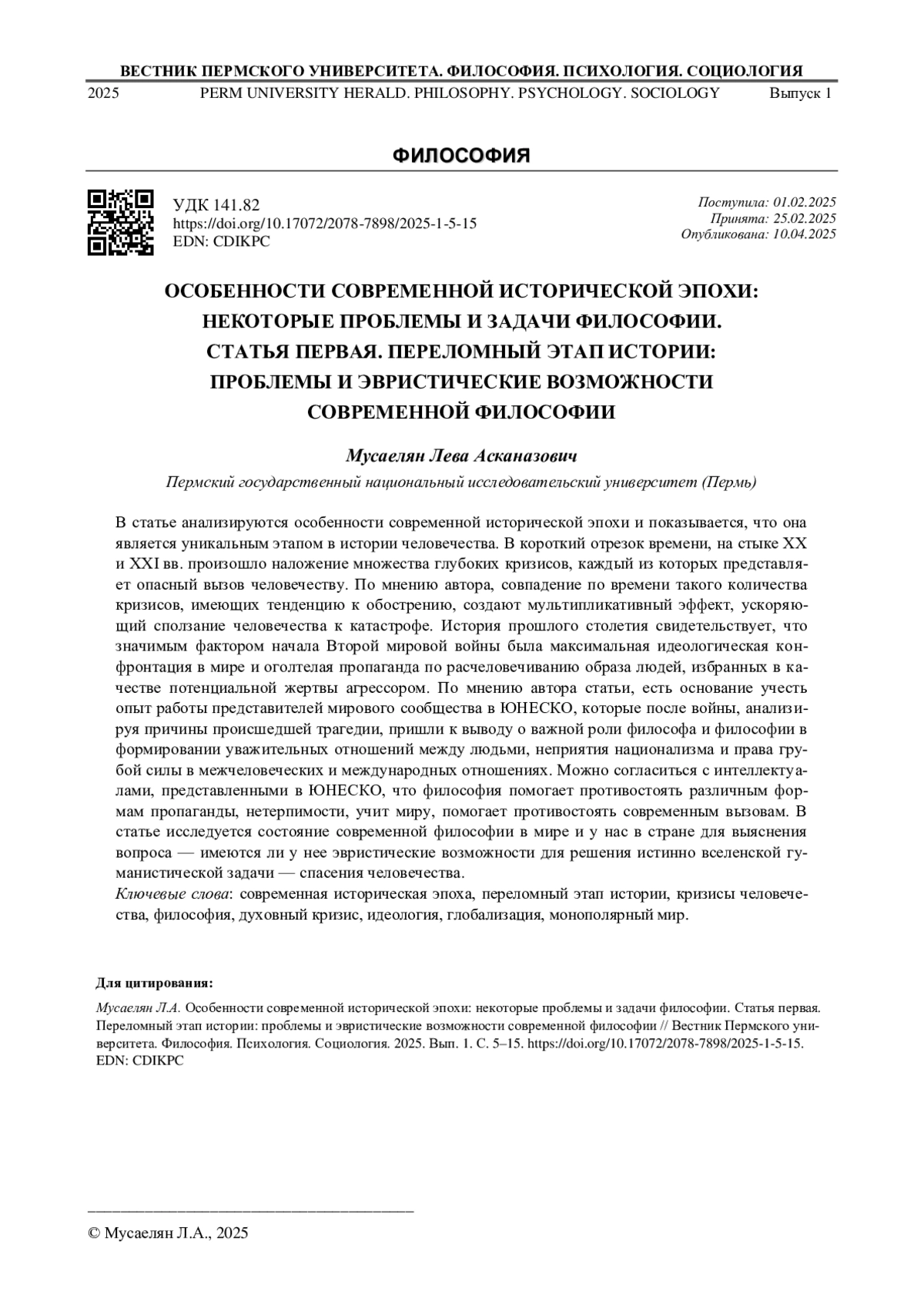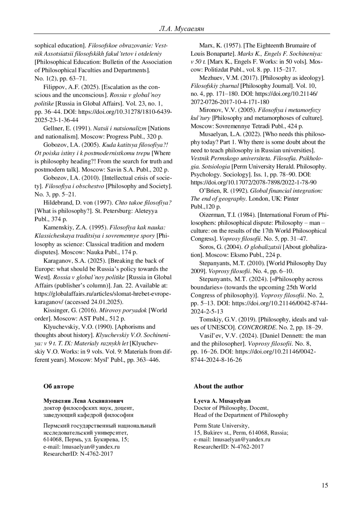 19. Мусаелян Л.А. Кому нужна сегодня эта философия? Статья первая. Почему существует сомнение в необходимости преподавания философии в вузах России // Вестник Пермского университета. Философия. Психология. Социология. 2022. Вып. 1. С. 78-90. DOI: 10.17072/2078-7898/2022-1-78-90 EDN: TONMSI