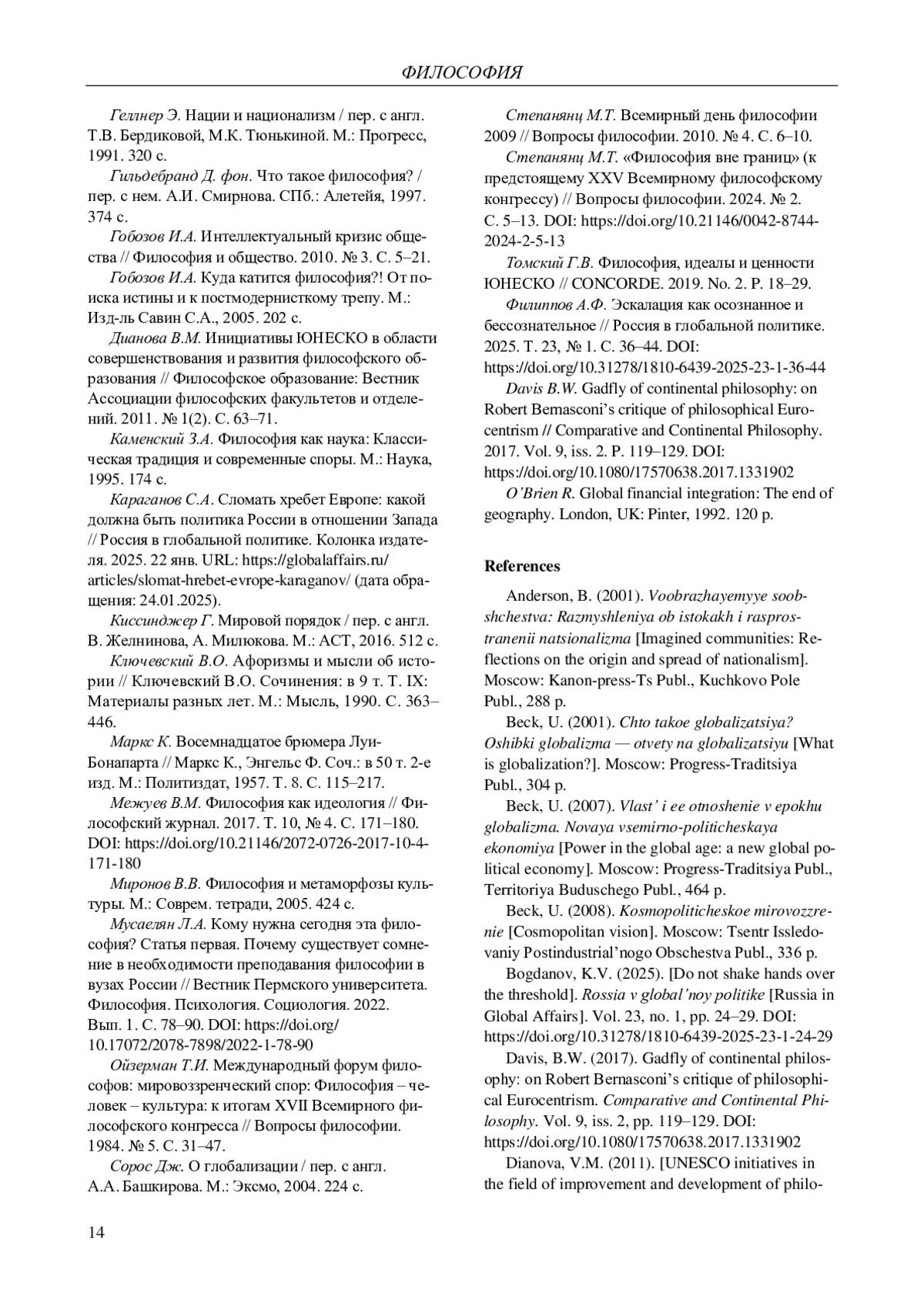 23. Степанянц М.Т. “Философия вне границ” (к предстоящему ХХV Всемирному философскому конгрессу) // Вопросы философии. 2024. № 2. С. 5-13. DOI: 10.21146/0042-8744-2024-2-5-13 EDN: HJZXVA