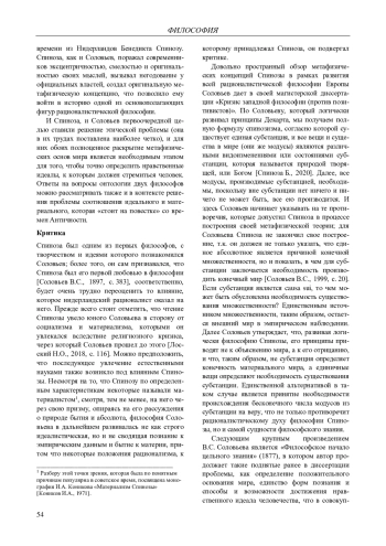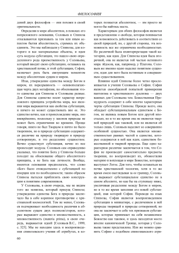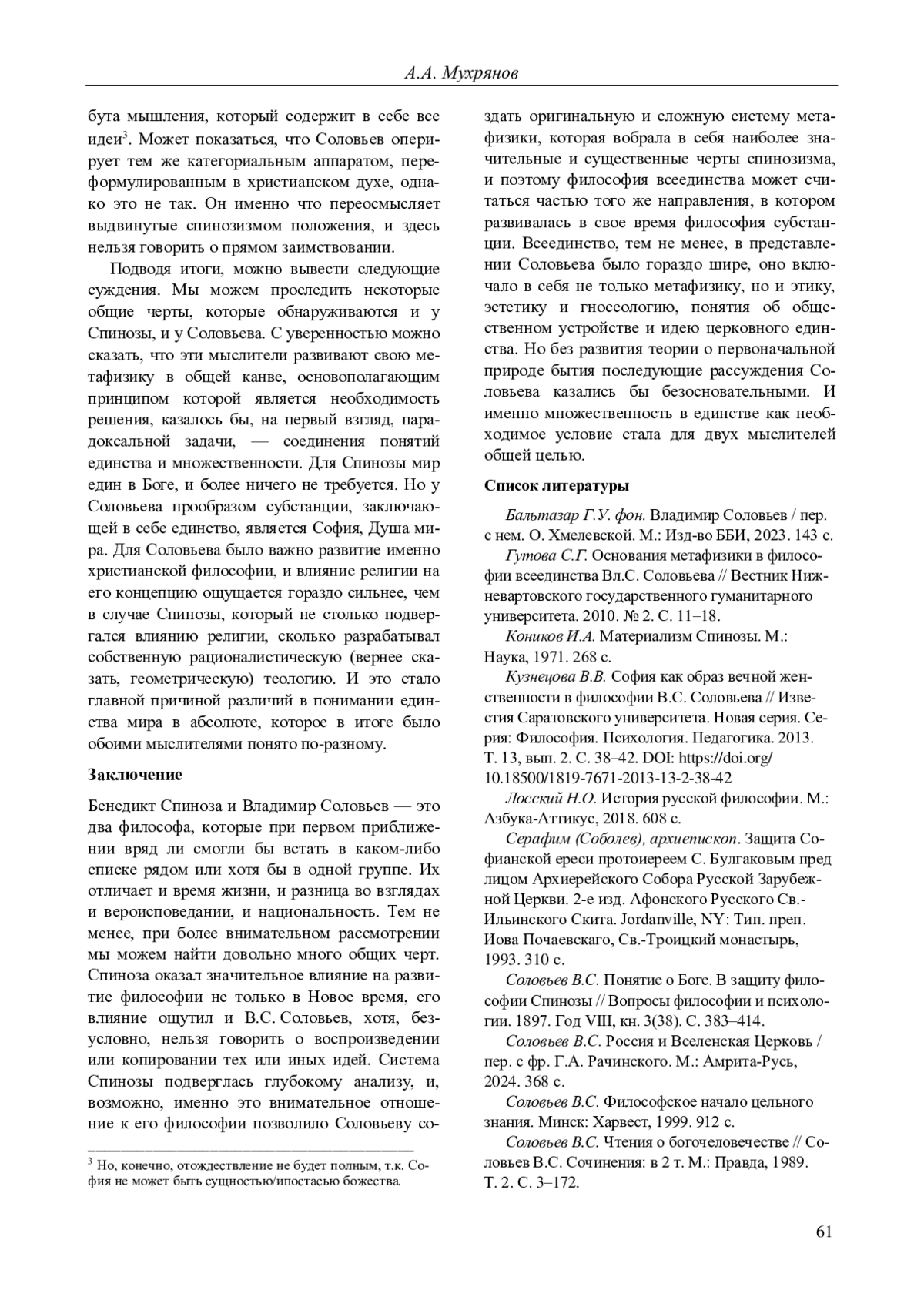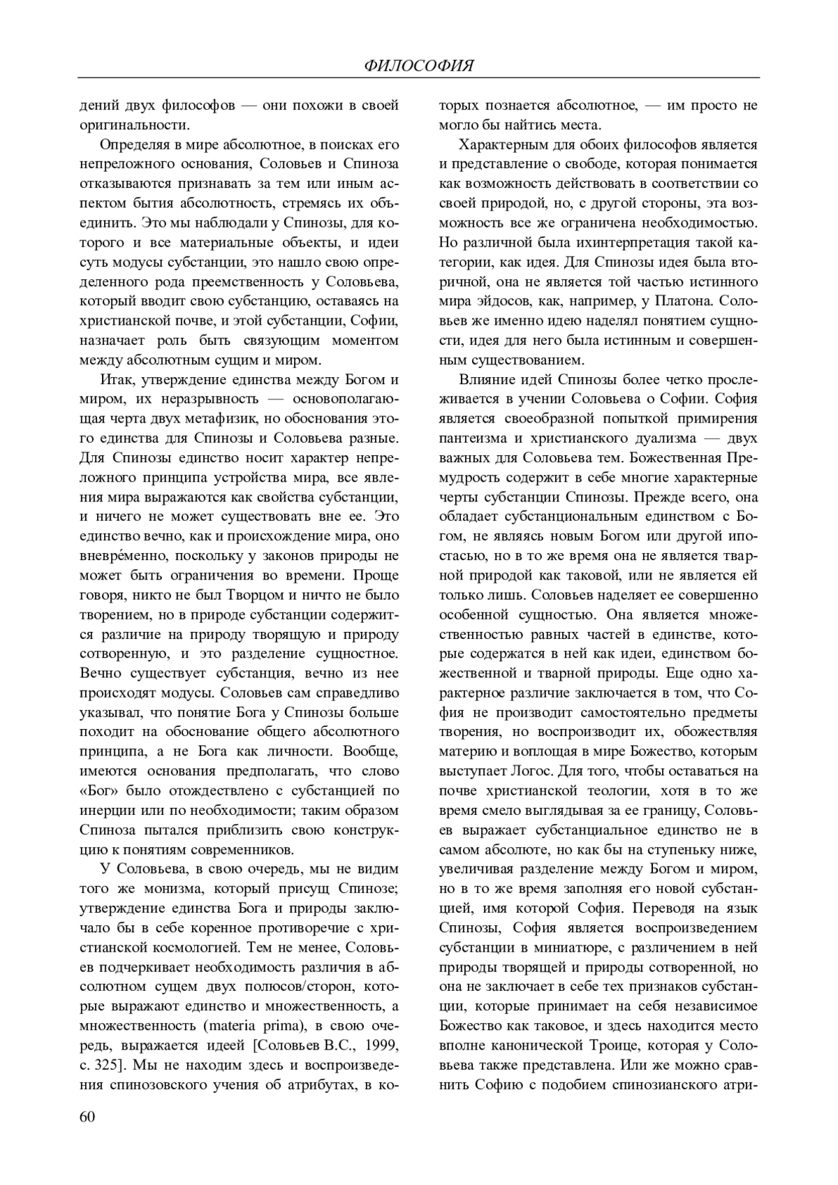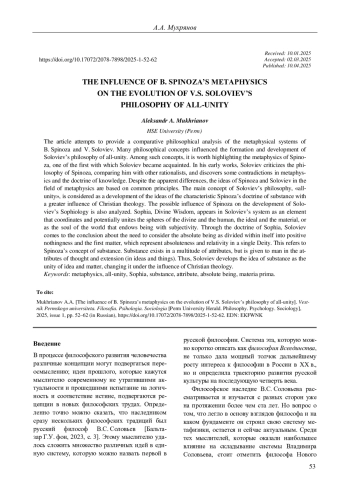 В статье предпринимается попытка сравнительного философского анализа метафизических систем Б. Спинозы и В. С. Соловьева. Многие философские концепции оказали влияние на формирование и развитие философии всеединства В. С. Соловьева. Среди таких концепций стоит выделить метафизику Б. Спинозы - одной из первых, с которой В. С. Соловьев познакомился. В первых сочинениях В. С. Соловьев подвергает критике философию Б. Спинозы, сравнивая его с другими рационалистами, и обнаруживает некоторые противоречия в метафизике и учении о познании. Несмотря на видимые различия, идеи Спинозы и Соловьева в области метафизики строятся на общих принципах. Основное понятие философии Соловьева, «всеединство», рассматривается как развитие идей характерного спинозовского учения о субстанции с бόльшим влиянием христианского богословия. Также рассматривается возможное влияние Спинозы на развитие софиологии В. С. Соловьева. София, Божественная Премудрость, выступает в системе Соловьева как элемент, согласующий и потенциально объединяющий сферы божественного и человеческого, идеального и материального, или как душа мира, наделяющая бытие субъектностью. Через учение о Софии Соловьев приходит к выводу о необходимости рассматривать абсолютное сущее как разделенное само в себе на положительное ничто и первую материю, которые представляют абсолютность и относительность в едином Божестве. Это отсылает нас к понятию субстанции у Спинозы. Субстанция существует во множестве атрибутов, но дается человеку в атрибутах мышления и протяженности (в идеях и вещах). Таким образом, представление о субстанции как о единстве идеи и материи развивает В. С. Соловьев, изменяя его под влиянием христианского богословия.