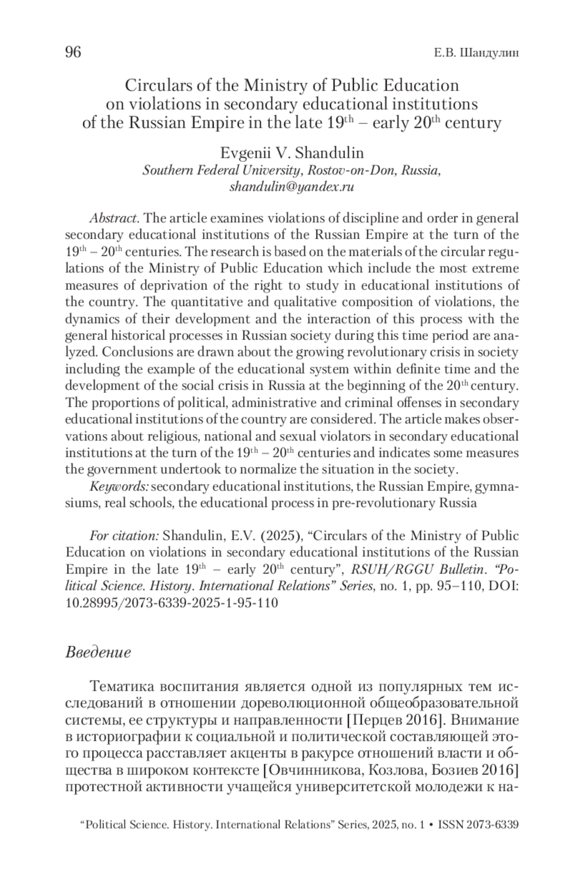 Статья посвящена изучению нарушений дисциплины и порядка в общеобразовательных средних учебных заведениях Российской империи на рубеже XIX–XX вв. В основе лежит изучение материалов циркулярных предписаний Министерства Народного просвещения с применением самых крайних мер лишения права на обучение в образовательных учреждениях страны. Проанализированы количественный и качественный состав нарушений, их динамика развития и взаимосвязь этого процесса с общеисторическими процессами в российском обществе в указанный период. Сделаны выводы о нарастании революционного кризиса в обществе на примере образовательной системы в определенных временных рамках, иллюстрирующих развитие социального кризиса в России в начале ХХ в. Рассмотрены пропорции политических, административных и уголовных преступлений в средних образовательных учреждениях страны. В статье сделаны наблюдения о религиозном, национальном и половом составе нарушителей в средних учебных заведениях на рубеже веков и указаны некоторые меры правительства по нормализации ситуации в обществе.